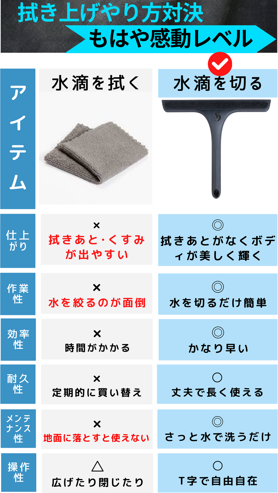 クロスは何度も使っていると車の油汚れが蓄積して、水道で洗った程度では落ちきれません。いくら性能のいいクロスでも、汚れていたら拭きムラが出ます。カースイーパーは、シリコン製なので汚れがさっと落ち、丈夫で長く使えて、さらに拭きムラができません。