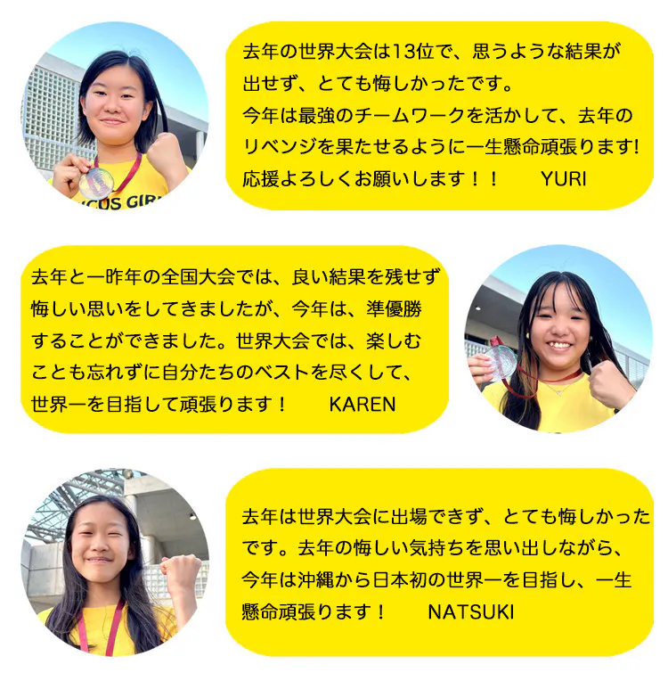 10年間、沖縄予選会優勝、全国優勝、世界一を目指して頑張ってきました。そして、小学生の時に初めて全国優勝し、世界の舞台に挑戦したハンガリー国際大会から5年。コロナでの大会中止等、苦しい時期を乗り越え、10年目の今年、ついに全国準優勝を果たして、3度目の国際大会の出場権を掴み取りました。