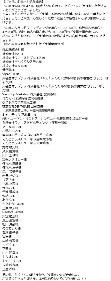 2024/12/13 10:42皆様からの心のこもった温かいご声援とともに、 「日本の未来を担う!ロボット競技で世界一を目指す子ども達の挑戦!」プロジェクトが終了し、応援してくださった88名のご支援者の皆様から1,116,000円のご支援をいただきました!!世界一を目指し、沖縄県代表、日本代表として頑張る子ども達を応援し、ご支援くださった皆様へ、心より深く感謝申し上げます。本当に本当にありがとうございました!!おかげさまで、トルコ国際大会で代表選手の子ども達は最後まで粘り強く頑張り、両チームとも世界のベストエイトに入ることができました!!■ROBOMISSION エキスパート競技 シニア部門 AMICUS R2K 世界6位/104チーム中■ROBOMISSION エキスパート競技 ジュニア部門 AMICUS GIRLs 世界7位/114チーム中大会中苦しい場面もありましたが、皆さまからの応援メッセージが大きな励みとなりました!!本当にありがとうございました!!大会の様子は、引き続き活動報告にてご報告いたします。また現在、リターンについて選手とスタッフが準備を進めております。数日中に感謝の気持ちを込めて、全ご支援者の皆さまへお届けする予定です。ご到着までもうしばらく、お待ちいただけますようお願い申し上げます。 もっと見る