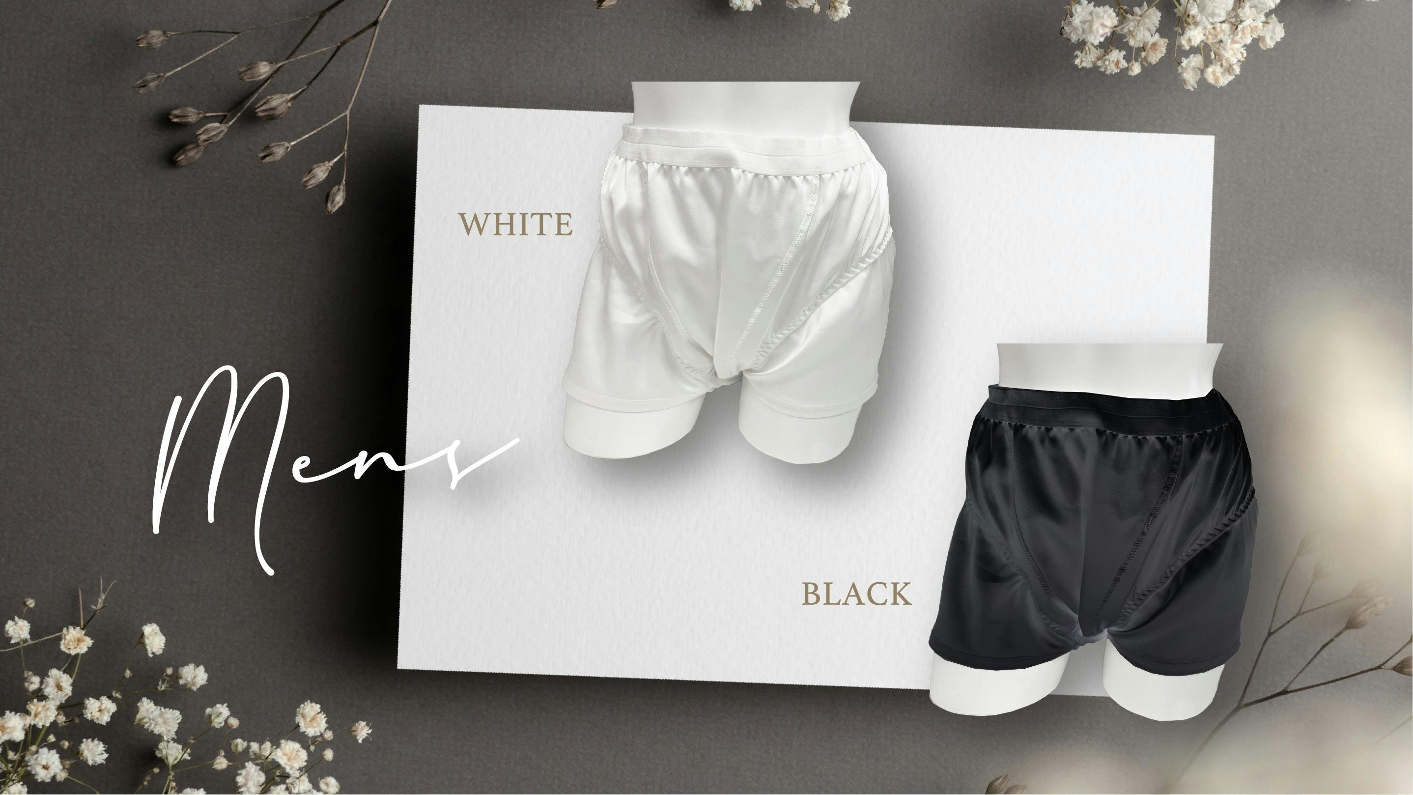 男性用はボクサートランクス型のデザインになっております。面ファスナーでウエスト調節ができる設計。内側は全面防水布を使用し、立体パターンで漏れにくい設計となっております。サテン生地を全面に使用したエレガントなデザインです。