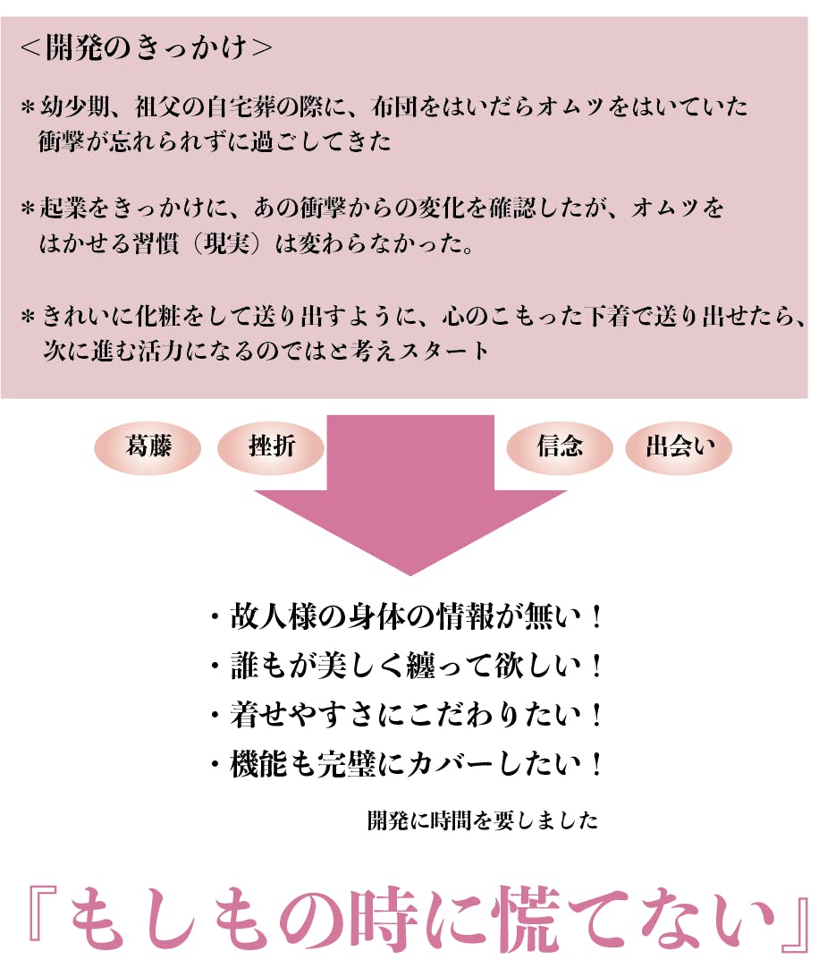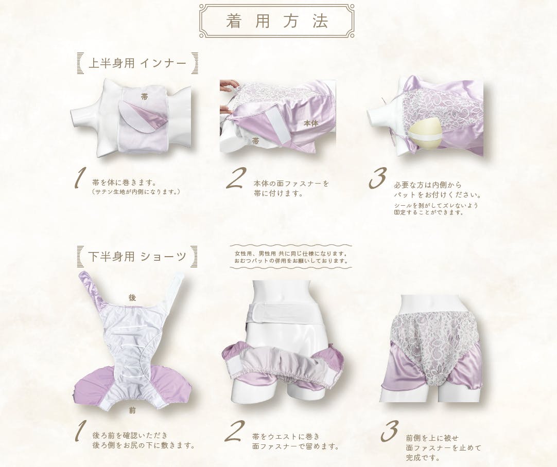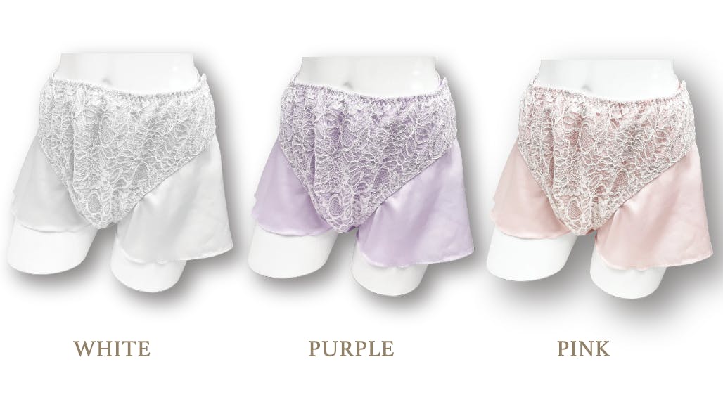下半身用ショーツはフレアパンティー型でウエストサイズは面ファスナーで調節可能。インナー同様のサテン生地とレースでエレガントに仕上げました。立体パターンで漏れにくい設計となっております。