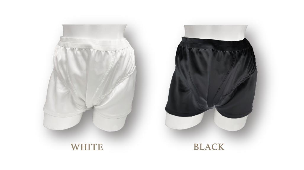 男性用はボクサートランクス型のデザインになっております。面ファスナーでウエスト調節ができる設計。内側は全面防水布を使用し、立体パターンで漏れにくい設計となっております。サテン生地を全面に使用したエレガントなデザインです。
