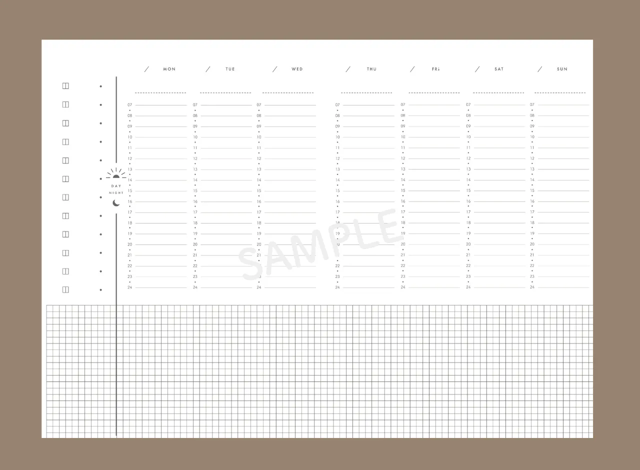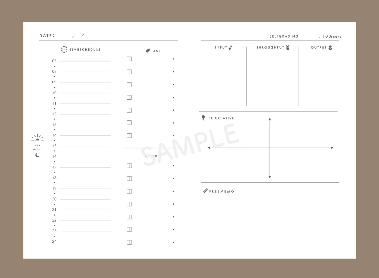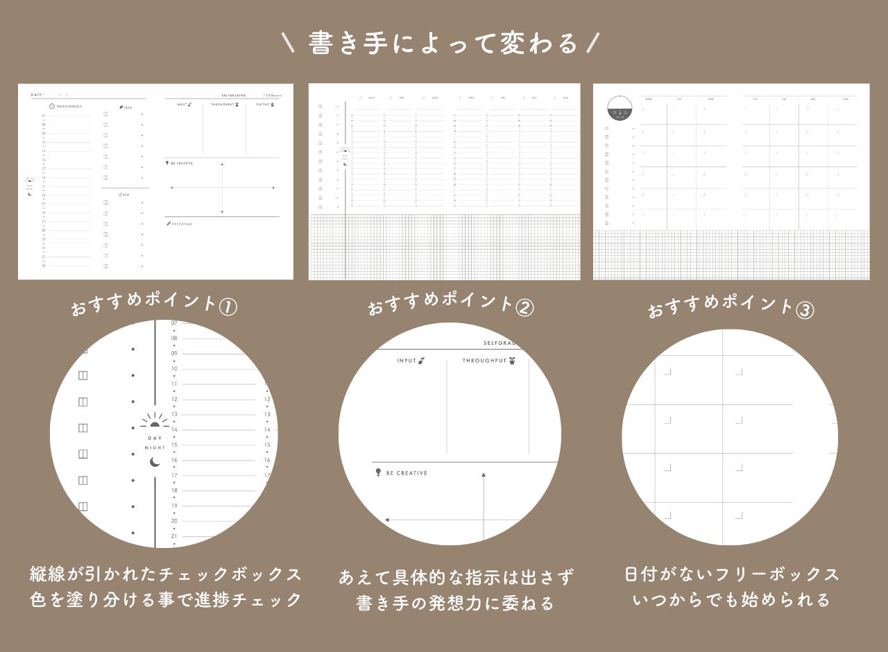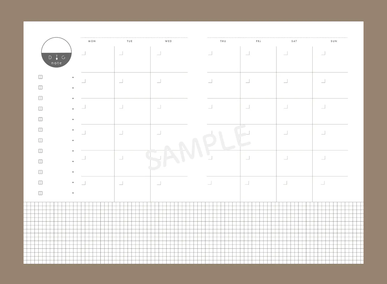 DIGノートは、タスクを深く掘り下げることに特化し、見開き1ページにスケジュールやアイデアを自由に書き込める設計です。一般的な手帳とは異なり、内容をあえて指定せず、書き手の発想に委ねる柔軟なデザインが特徴です。各ページの点線や斜線、チェックボックスも使い方が決まっておらず、あなたのワークスタイルや気分に合わせて自由に活用できます。おすすめの使い方も後ほど紹介します!