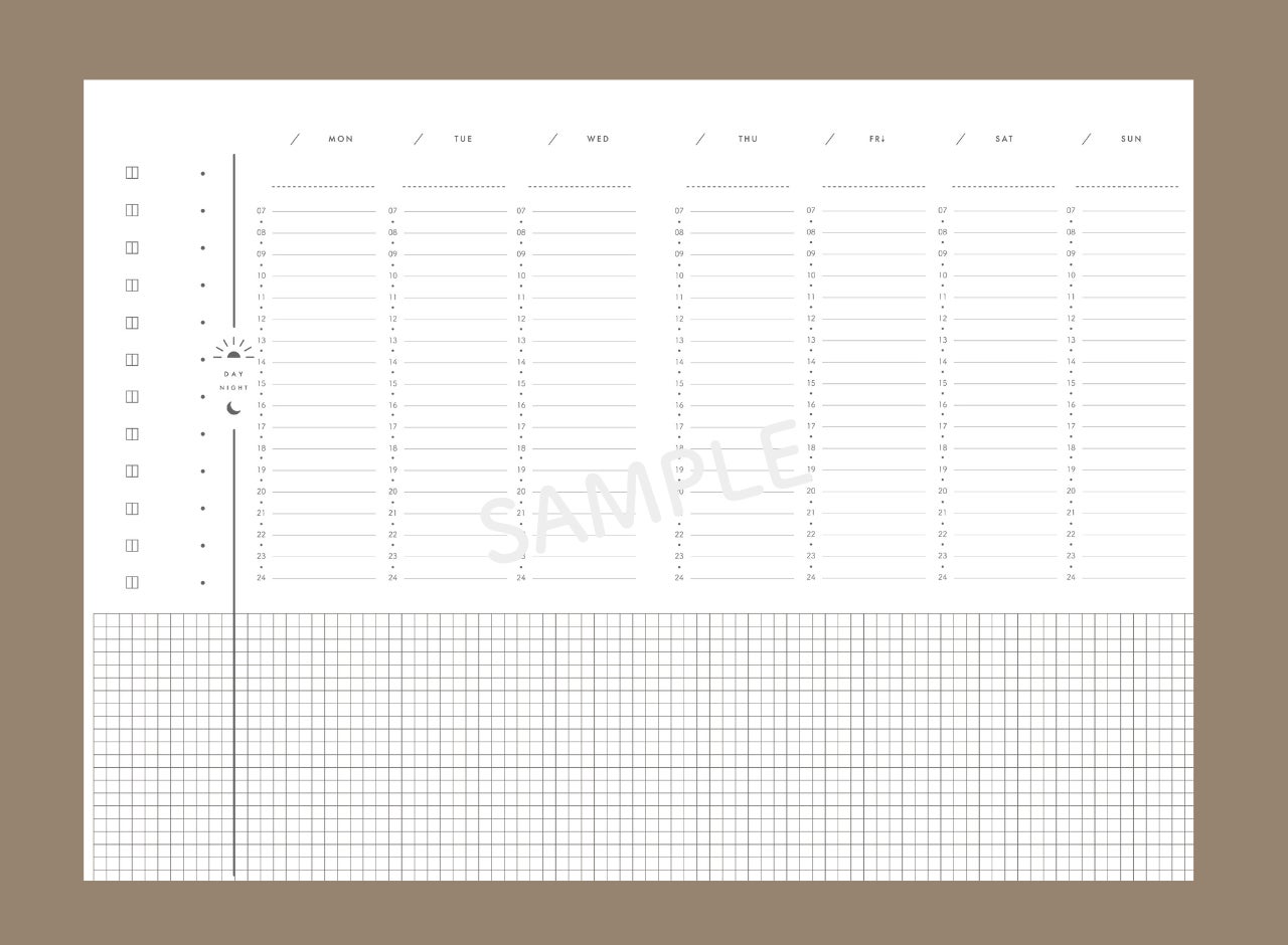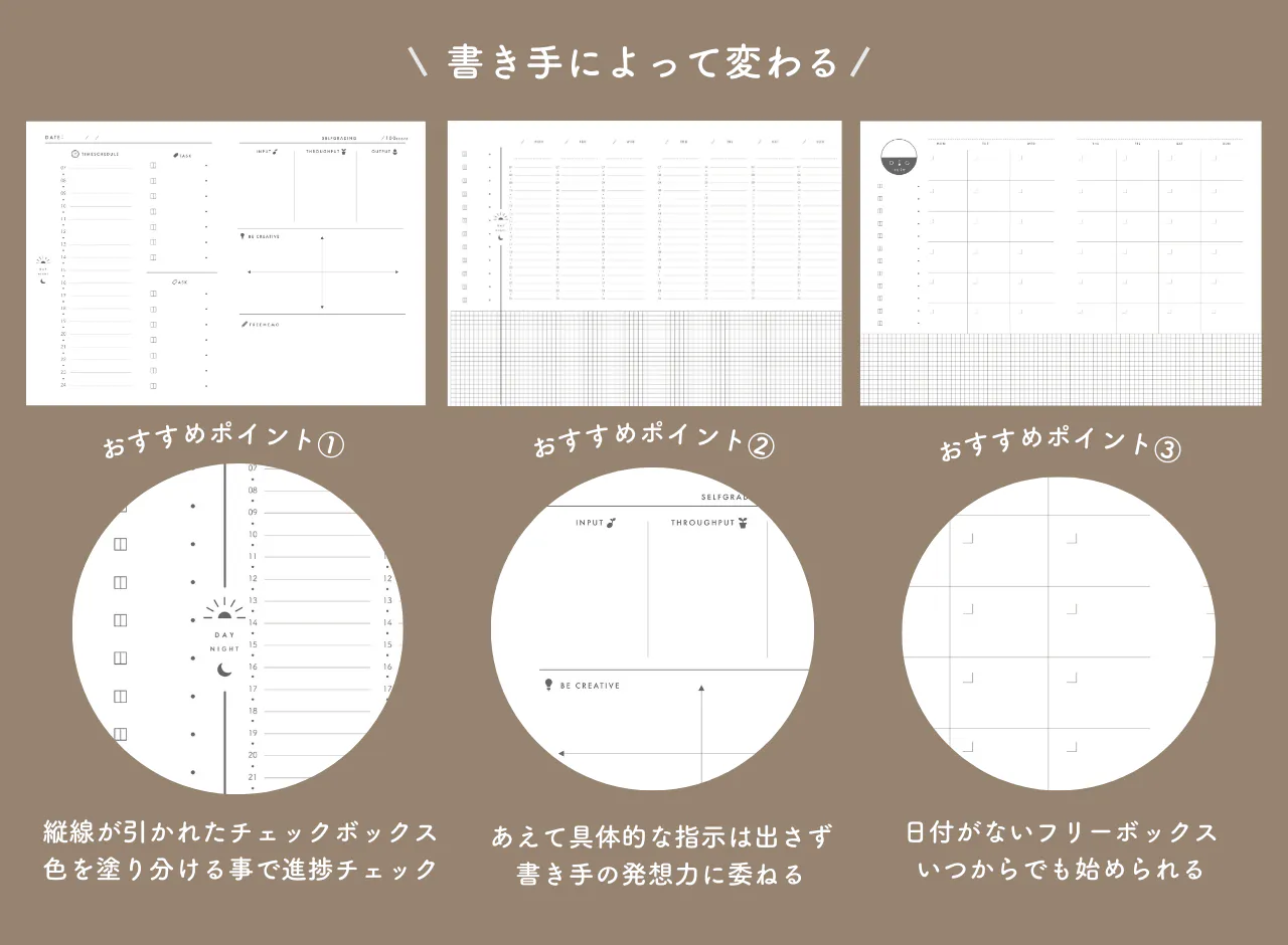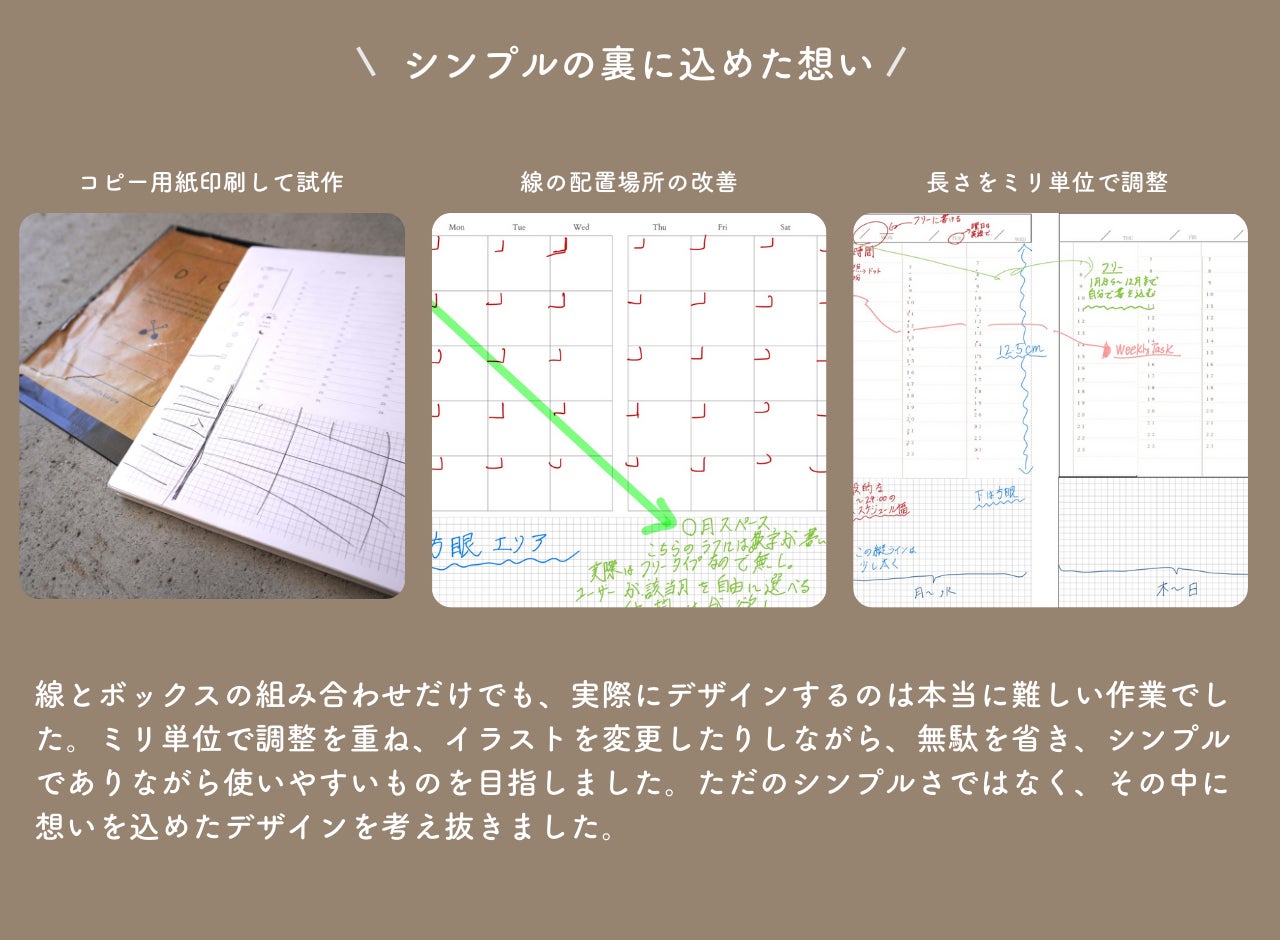 今まで当たり前に目にしてきた手帳の構造。シンプルに見えて、線を組み合わせるだけのデザインですが、その「使いやすさ」を追求するのは本当に難しいことです。どの手帳にも使いやすいデザインはありますが、自分の想いをどう反映させるか、何度も試行錯誤を重ねてきました。