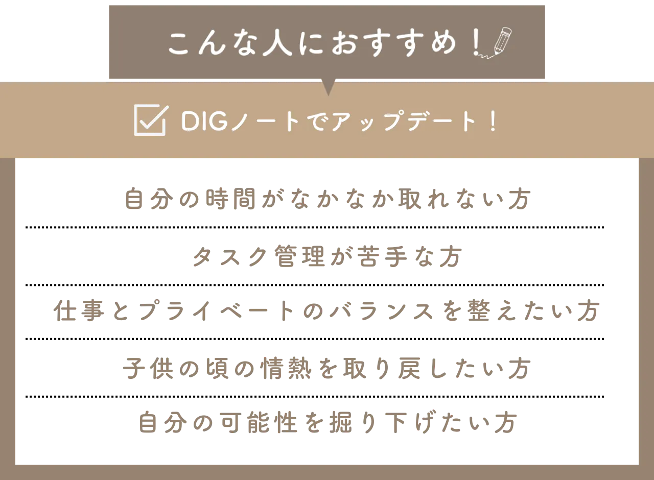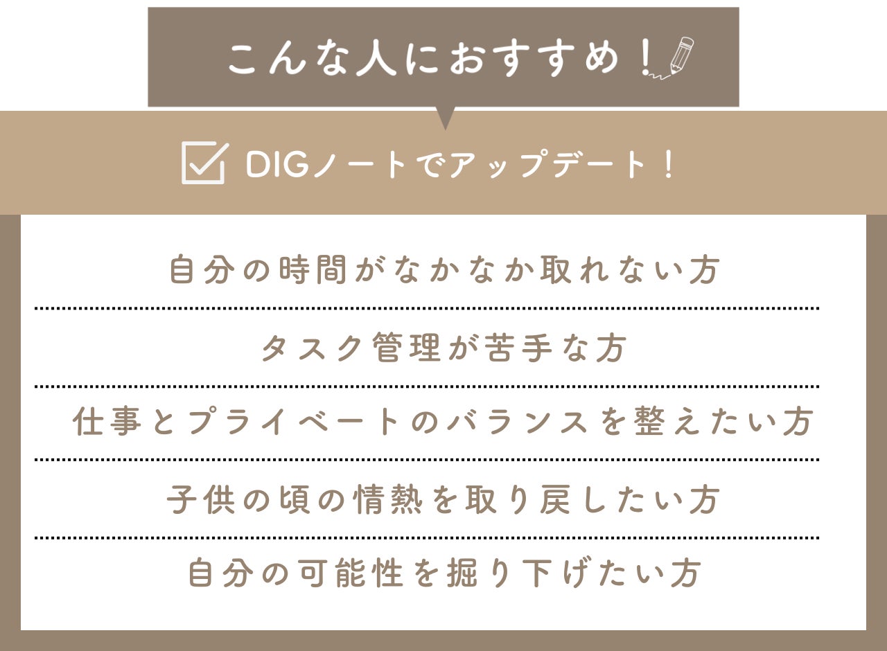 DIGノートは、仕事に追われるのではなく、自分の時間をコントロールできるようサポートするためのツールです。使いながら、あなたが本当に大切にしたいことに集中できるように一緒に進んでいきましょう。