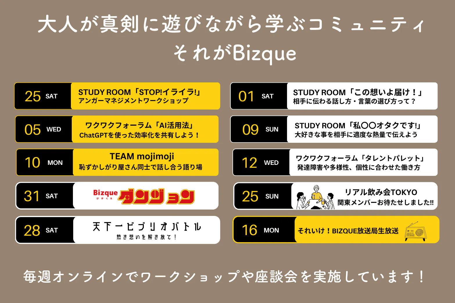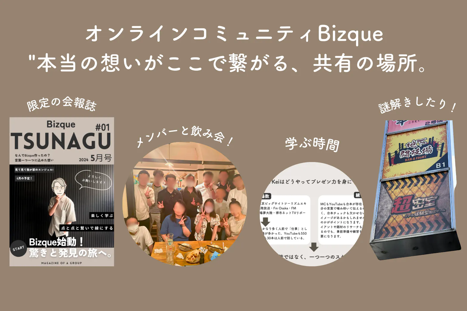 今年5月に立ち上げたオンラインコミュニティBizque」では、同じ目的を持ったメンバーが集まり、YouTubeでは伝えきれなかったことを共有しています。