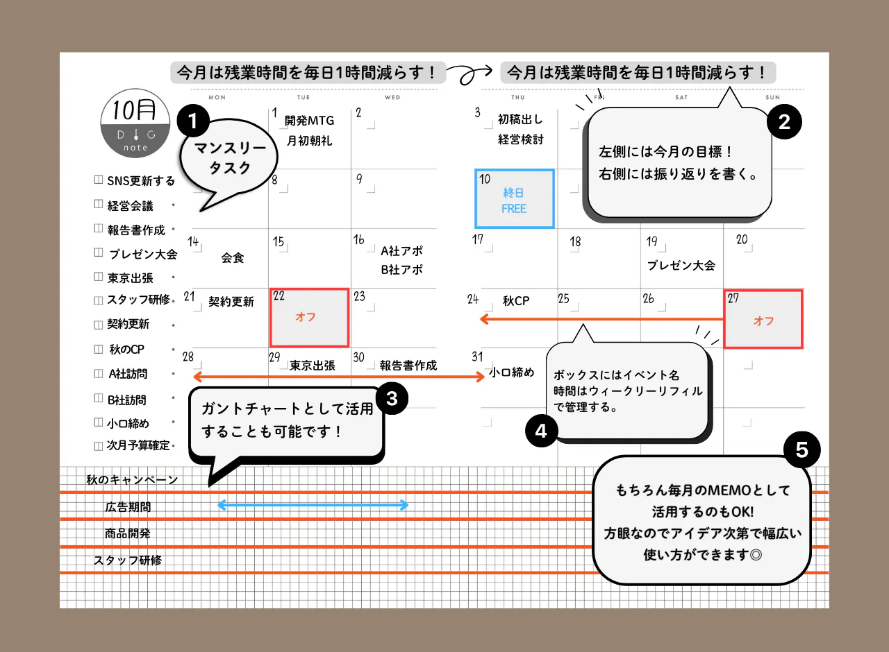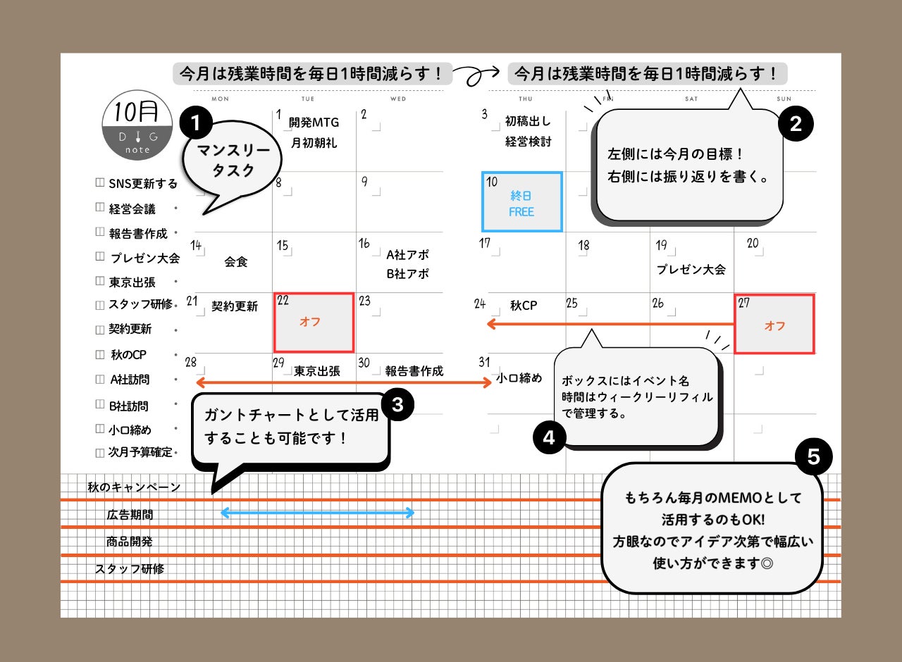 ②左右の上段にある点線には「今月の目標」や「今月の振り返り」を記入するもオススメです。