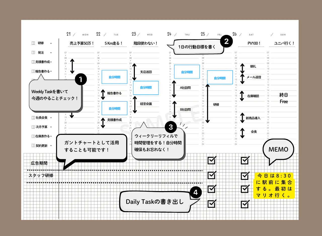 ⑤MEMOエリアももちろんあり!デイリーリフィルでスケジュール管理からアイデアまでしっかり管理しましょう。