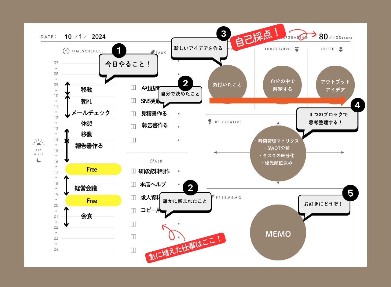 ①左側の時間管理エリアにはその日の行動予定を書き込む。大きめにデザインしているので、ゆったり書き込めます!