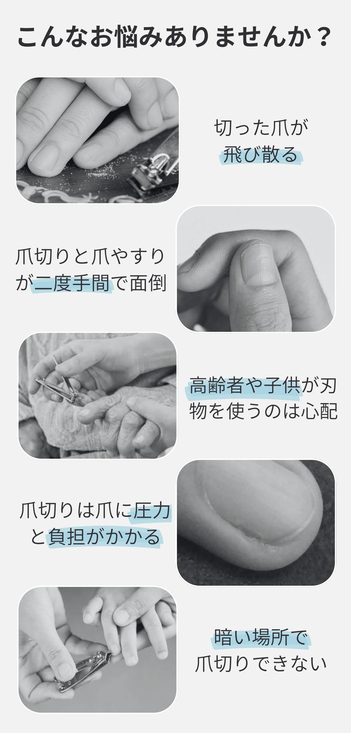 日常でも子供の爪切りで深爪をさせてしまう心配もなくなり、暗い場所でも危ないと思った時にすぐ爪を整えることができるので、危険な場面が減りました。同じ心配を抱えている皆様にも是非体感して欲しいと思い、起案させていただきます。