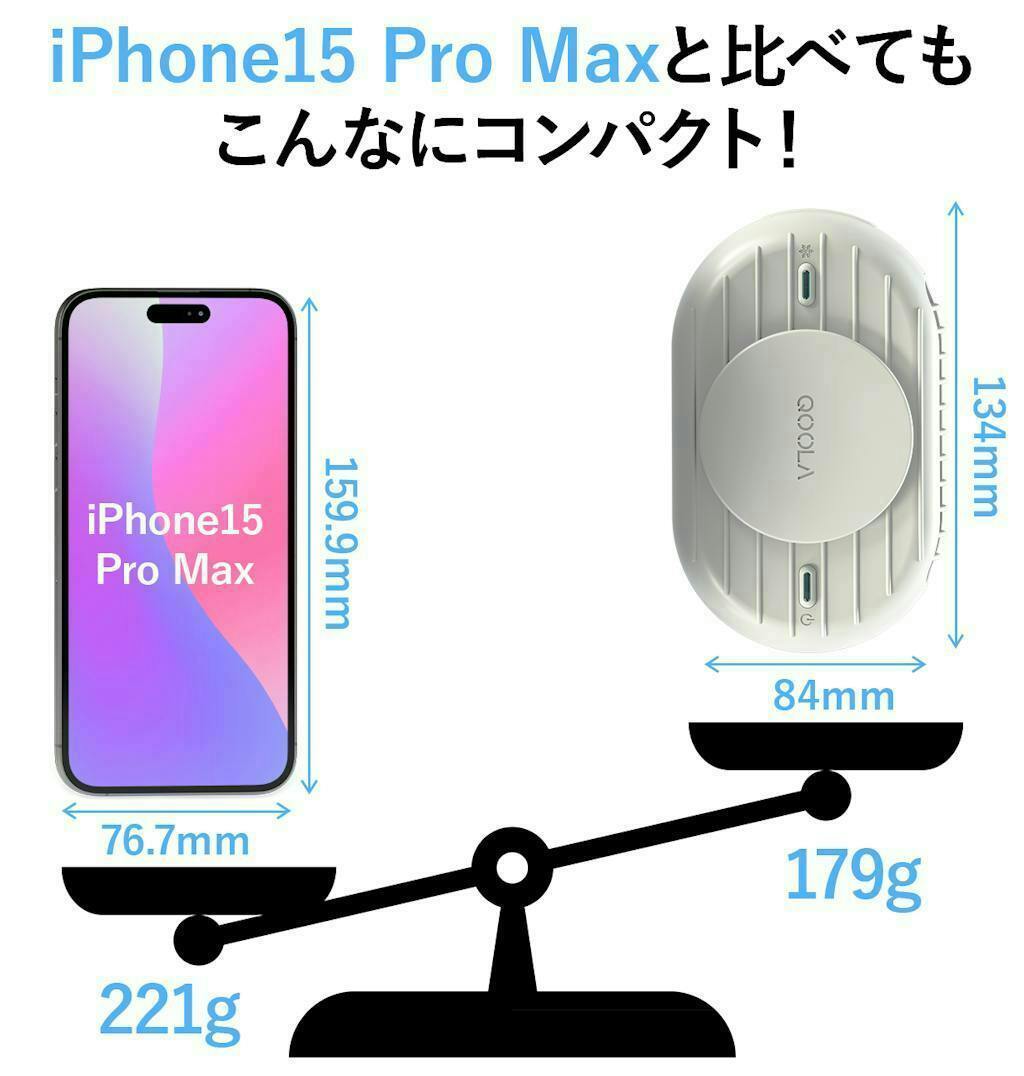 QOOLA Proは、驚くほどコンパクトで軽量なデザインです。たとえば、iPhone15 Pro Maxと比較しても、そのサイズ感は圧倒的にコンパクトです。このコンパクトさが、QOOLA Proの大きな魅力となっています。どこにでも持ち運びやすく、全身のさまざまな部位で使用できるため、外出先やオフィス、家庭など、さまざまなシーンで活躍します。