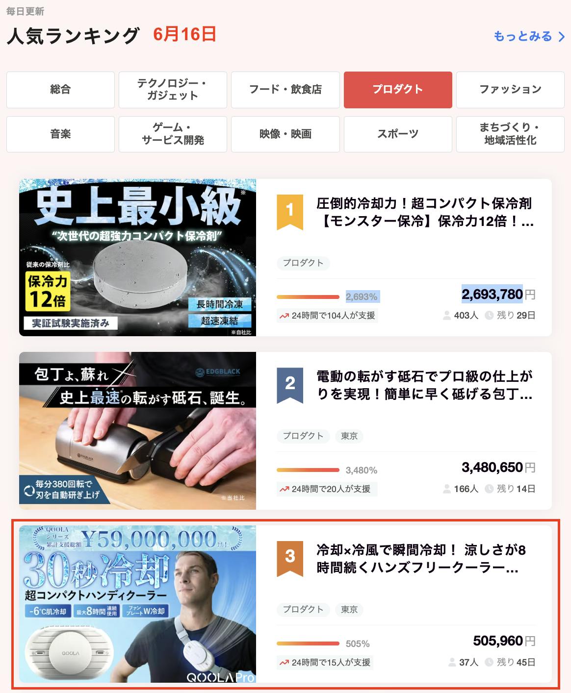 おかげさまで開始から10分で目標を達成することが出来ました。人気ランキングのプロダクト部門 3 位!カテゴリで 3 位に入賞することが出来ました!