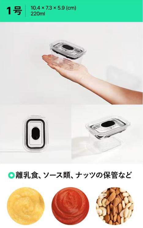 1号 (10.4 x 7.3 x 5.9 cm - 220ml): 離乳食やソース、ナッツ類の保存に最適。小さくて冷蔵庫にもぴったりです。