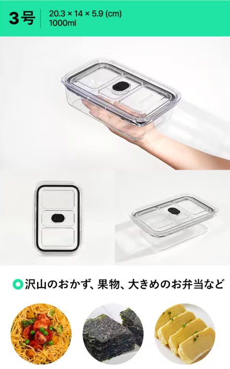3号 (20.3 x 14 x 5.9 cm - 1000ml): おかずや果物、大きめのお弁当など、家族分の食事を保存するのに最適なサイズです。