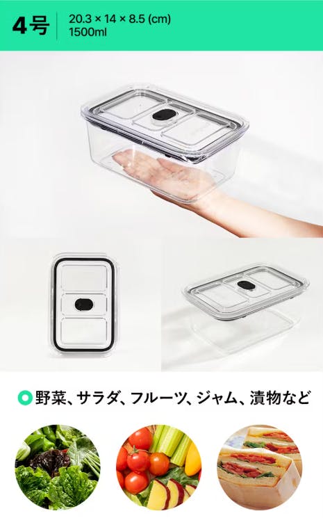 4号 (20.3 x 14 x 8.5 cm - 1500ml): 野菜、サラダ、フルーツ、ジャムや漬物など、容量が大きくて保存しやすいサイズです。