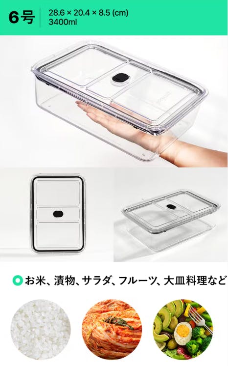 6号 (28.6 x 20.4 x 8.5 cm - 3400ml): お米や漬物、大皿料理など、たっぷりと保存したい場合にぴったりの大容量サイズです。