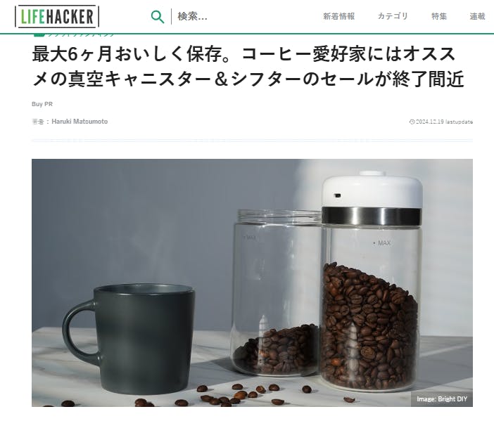 皆様こんばんは!Brightチームです。12月19日、Lifehackerで「SHELBRUビーンケアセット」を紹介して頂きました。話題:最大6ヶ月おいしく保存。コーヒー愛好家にはオススメの真空キャニスター&シフターのセールが終了間近興味がある方、是非下記のリンクからアクセスしてみてください。https://www.lifehacker.jp/article/machi-ya-shelbru-end-794023/【レビューの一部抜粋】〈酸化を防いでおいしいコーヒーを長く挽きたての豆で淹れたコーヒーは格別! とはいえ、豆の鮮度は落ちやすいので最大限に楽しめる期間は少ないのがネック。そんな状況を防いでくれるのが「SHELBRUビーンズケアセット」。コーヒー好きの人には定番のたっぷり真空保存できるキャニスターセットです。ボタンを押せば約15秒で瓶の中が真空状態になり酸化スピードを大幅に低減。一般的な瓶なら2週間ほどで劣化するところを、真空状態で最大6ヶ月程度も品質維持が可能だそう。これなら、挽いて飲む頻度的に豆の購入を諦めていたという人でもゆっくり長くおいしいコーヒーが楽しめますね。時間の経過で真空状態が弱まりますが、「SHELBRU真空キャニスター」は空気圧を検知して自動で気圧維持してくれる点が便利なポイントです。バッテリー残量や動作状況は蓋のライトで確認が可能。充電はUSB Type-Cケーブルで行いフル充電で約4000時間も使えるので、充電の手間は気にしなくてもよさそうですね!〉ご興味のある方はこの機会をお見逃しなく!https://camp-fire.jp/projects/794023/view12月25日まで販売期間は続きますので、ぜひSNSでのシェアや身近な方にもおすすめしていただけると嬉しく思います。#brightdiyどうぞよろしくお願い致します。BRIGHTチーム
