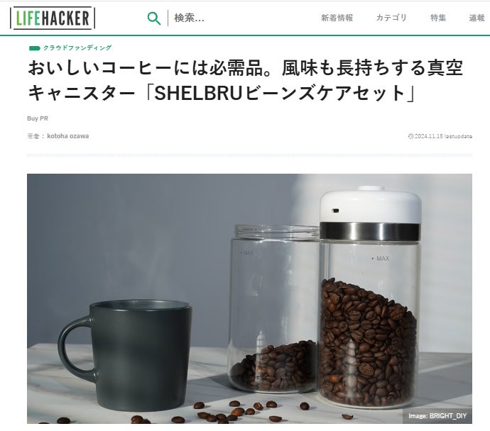 皆様こんばんは!Brightチームです。11月15日、Lifehackerで「SHELBRUビーンケアセット」を紹介して頂きました。話題:おいしいコーヒーには必需品。風味も長持ちする真空キャニスター「SHELBRUビーンズケアセット」興味がある方、是非下記のリンクからアクセスしてみてください。https://www.lifehacker.jp/article/machi-ya-shelbru-start-794023/ 【レビューの一部抜粋】〈 酸化を抑制しておいしいコーヒーを挽きたての豆で丁寧に淹れたコーヒーは格別ですよね! とはいえ、豆の鮮度や風味が落ちていればせっかくの1杯を最大限には楽しめません。そんな状況を防いでくれるのが「SHELBRUビーンズケアセット」。コーヒー好きの人には定番の真空保存をたっぷりできるキャニスターセットです。ボタンを押せば約15秒で瓶の中が真空状態になり、酸化スピードを大幅に低減。一般的な瓶なら2週間ほどで劣化してしまいますが、真空状態では最大6ヶ月程度も品質維持が可能だそう。これなら、挽いて飲む頻度的に豆の購入を諦めていたという人でもゆっくり長くおいしいコーヒーが楽しめますね。時間の経過で真空状態が弱まりますが、「SHELBRU真空キャニスター」は空気圧を検知して自動で気圧維持してくれる点が便利なポイントです。バッテリー残量や動作状況は蓋のライトで確認が可能。充電はUSB Type-Cケーブルで行いフル充電で約4000時間も使えるので、充電の手間は気にしなくてもよさそうですね!〉ご興味のある方はこの機会をお見逃しなく!https://camp-fire.jp/projects/794023/view12月25日まで販売期間は続きますので、ぜひSNSでのシェアや身近な方にもおすすめしていただけると嬉しく思います。#brightdiyどうぞよろしくお願い致します。BRIGHTチーム