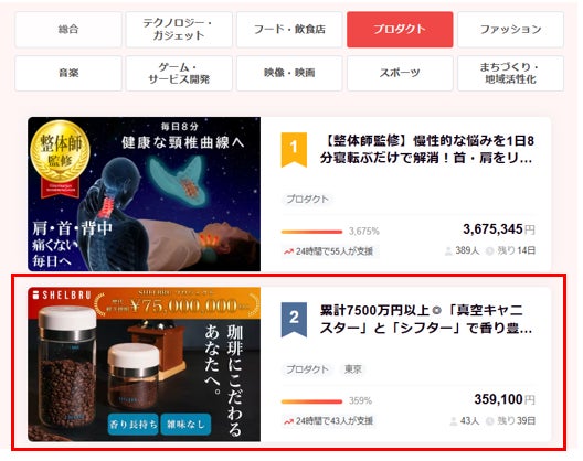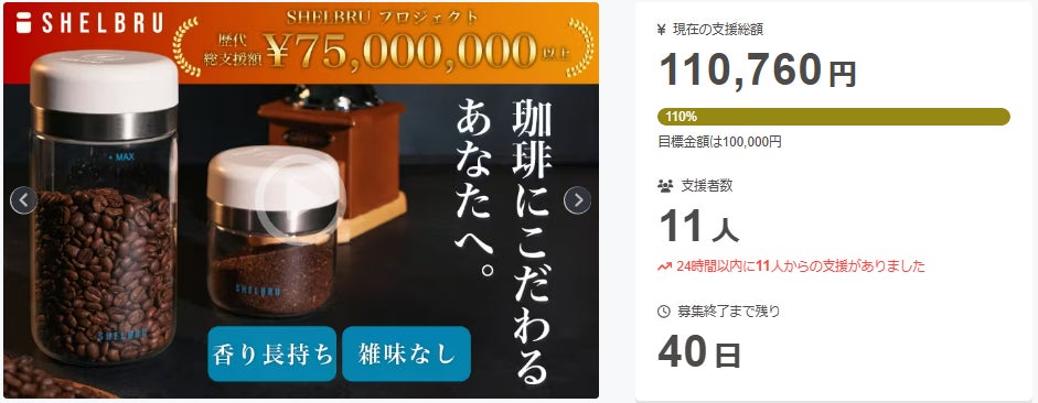 皆さんこんにちは、Brightチームです。この度は「累計7500万円以上◎「真空キャニスター」と「シフター」で香り豊かで雑味のない!」を支援いただき、本当にありがとうございます。おかげさまで開始から時間で目標を達成することが出来ました。また本日のCampfire人気ランキングプロダクト部門で 2位に入賞することが出来ました!皆さまの支援を励みに、喜んでいただける製品作りに努めてまいります。12月中旬まで販売期間は続きますので、ぜひSNSでのシェアや身近な方にもおすすめしていただけると嬉しく思います。https://camp-fire.jp/projects/794023/viewどうぞよろしくお願いいたします。ありがとうございました。スタッフ一同