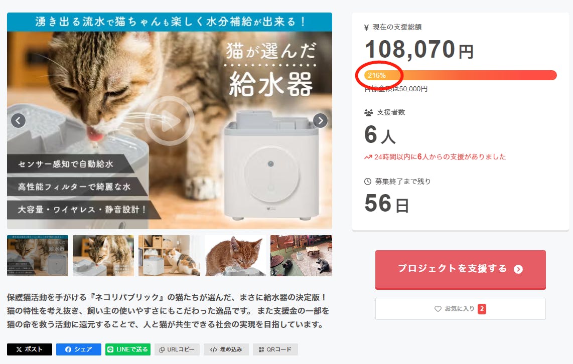 プロジェクト開始から約4時間弱で達成率216%達成!!!