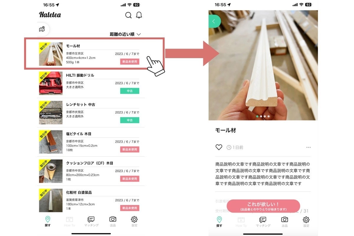 「ハレレア」は、建築現場で発生する廃材をDIY愛好者や木工職人に提供するためのマッチングアプリです。