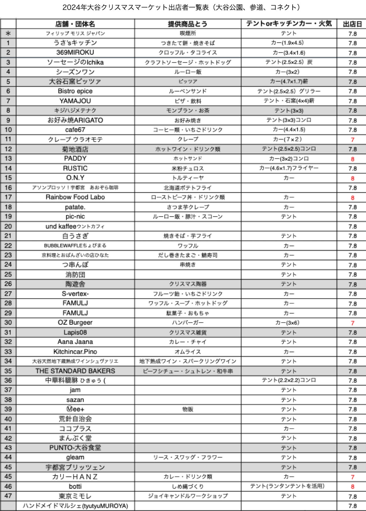 今日までに参加いただける出演者様、出店者様です。