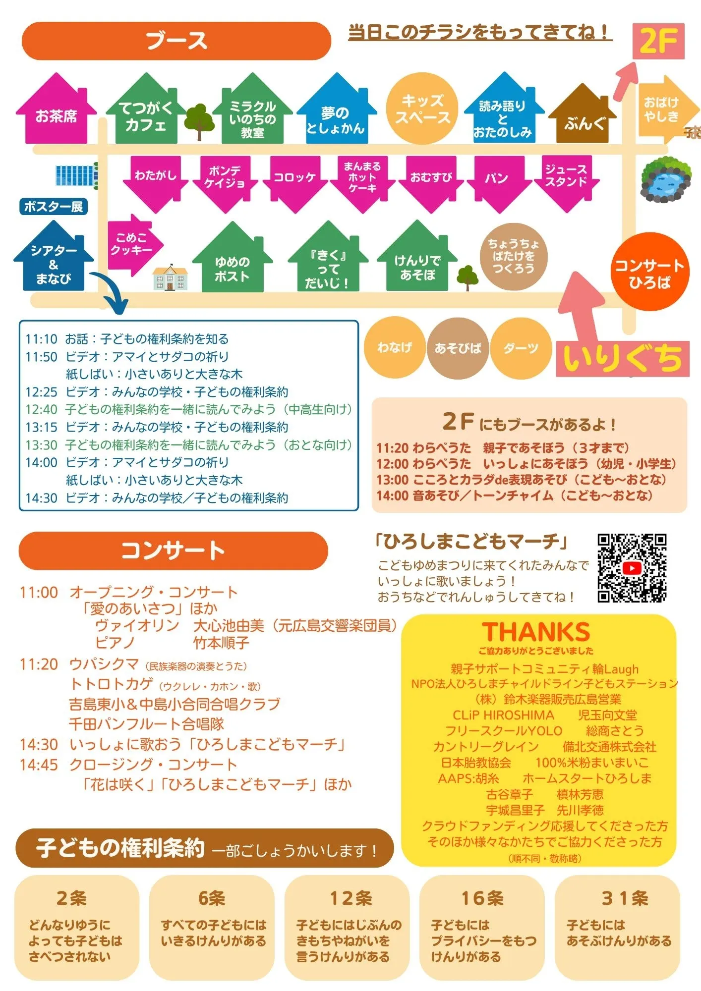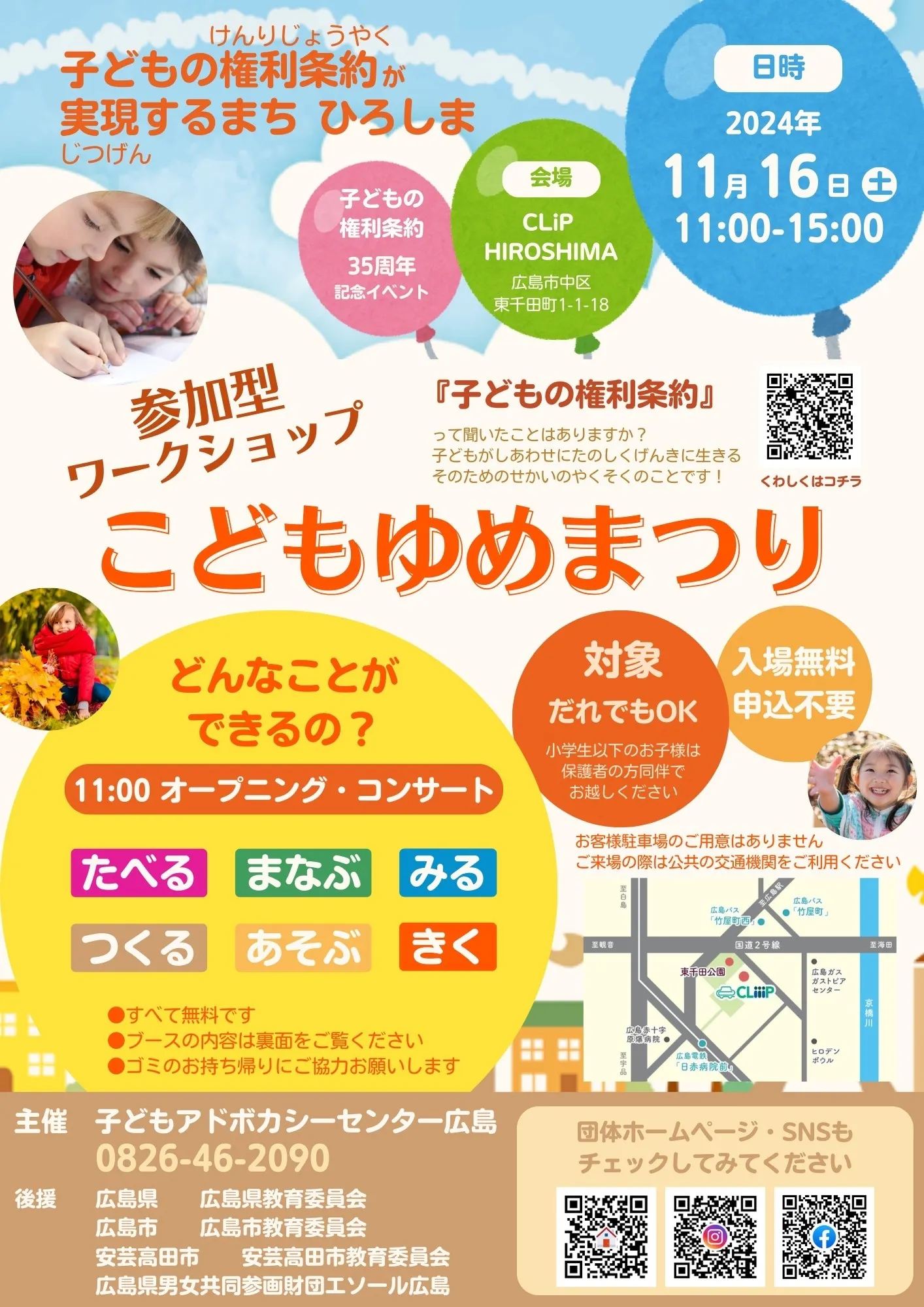 子どもの権利条約をお知らせするための11月16日(土)のイベント「こどもゆめまつりー子どもの権利条約が実現するまち ひろしま」が、みなさんの子どもの権利条約実現の働きのきっかけとなりますように!