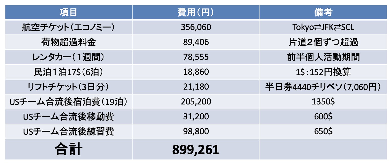 ・2024/9/3-10/3 チリ遠征費用実例(※遠征1回の費用内訳をご確認ください)