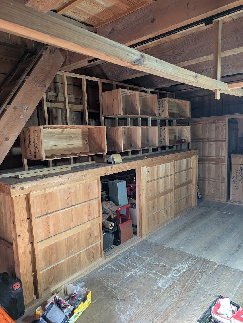 また、店舗工事も大詰めを迎えています。輪島塗の御膳一式が入っていた箱を使って陳列棚が設置されました。