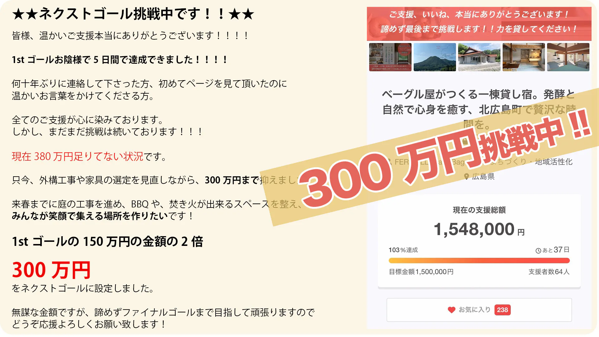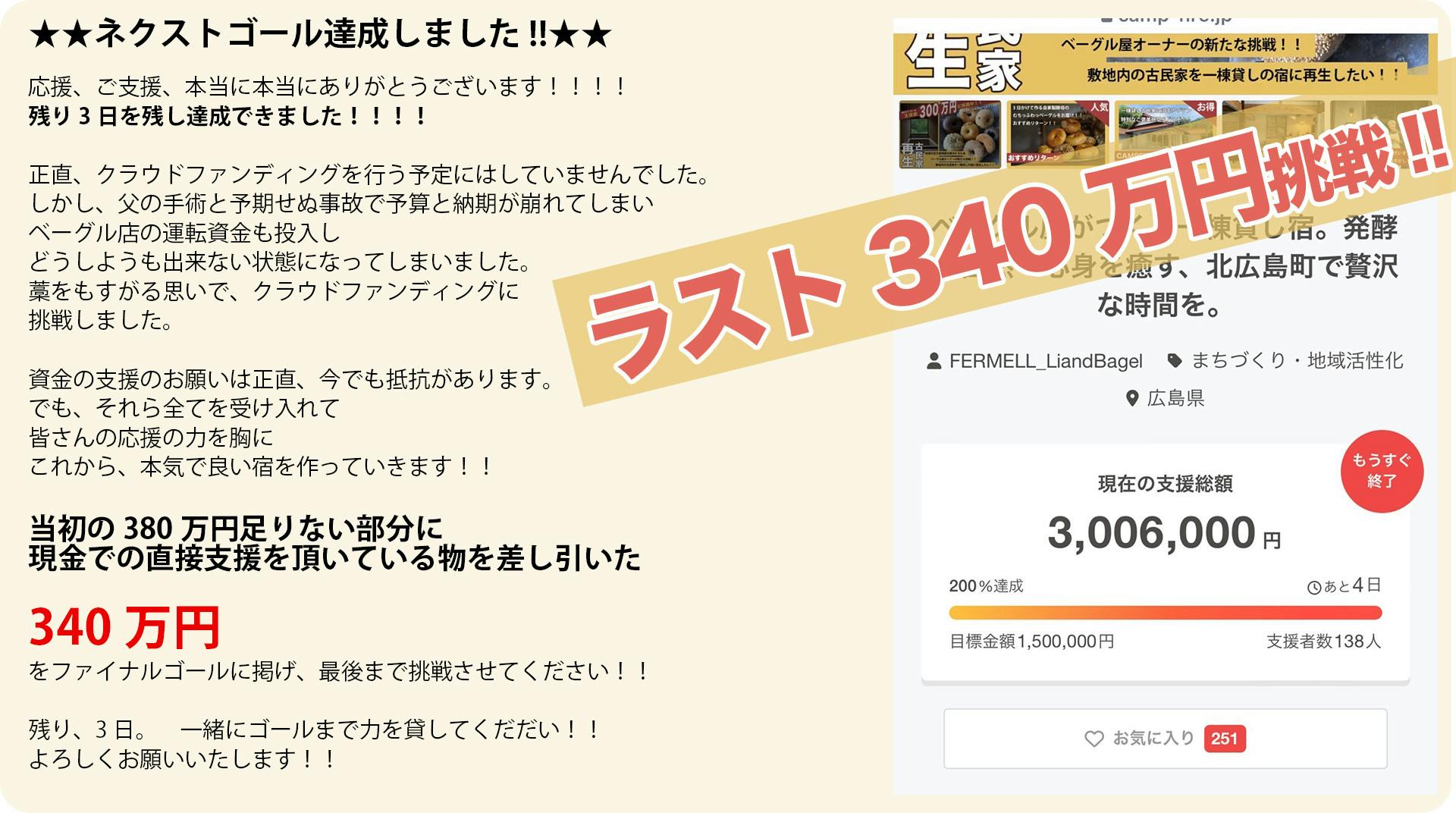 2024/11/25 22:45報告が遅くなってすみません!昨夜深夜0時をもって、私たちのクラウドファンディングが無事に終了いたしました!そして、最終結果として 目標の340万円 を見事達成することができました!!これもひとえに、支援してくださった皆様一人ひとりのおかげです。本当に、本当に、ありがとうございました!!たくさんのご支援、応援の声に感謝今回のクラウドファンディングには、延べ 171名 の方々からのご支援をいただき、金額は3,621,000円です。目標を超えるご支援だけでなく、SNSでのシェアや、応援のコメント、周りの方々への声がけなど、皆様からいただいたサポートのすべてが大きな力となりました。また、プロジェクトを通じて再びつながれた方々や、新しく出会えた方々にも心から感謝しています。皆様のお気持ちをひしひしと感じながら、挑戦の毎日を乗り越えることができました!プロジェクトを進めるこれから皆様からのご支援は、リターンの準備やプロジェクトの最終仕上げ、さらに宿を訪れる方々に特別な体験をお届けするための大切な資金として、大切に使わせていただきます!具体的には、 庭の整備やインテリアの充実、宿全体の最終調整、発酵プログラムの準備に活用し、支援者の皆様が誇りを持って応援したと言えるような宿に仕上げます。これからの進捗も随時活動報告でお伝えしていきますので、ぜひ楽しみにしていてください^_^感謝を超えた「恩返し」を目指して皆様からいただいた支援は、私たちにとって金額以上の意味があります。それは、私たちの夢を一緒に応援し、形にしてくださる心の支えそのものです。だからこそ、このプロジェクトを成功させ、皆様に恩返しすることが私たちの使命だと考えています!!宿を訪れる方々に最高の体験を提供することで、応援してよかったと思っていただける結果を目指します。最後にこのクラウドファンディングは終わりましたが、私たちの挑戦はこれからが本番です。プロジェクトを通じて出会った皆様とのつながりを大切にしながら、一歩一歩進んでいきます。本当にありがとうございました!そして、これからも温かく見守っていただけたら幸いです。宿泊の予約方法やリターンの商品の発送方法など現在まとめていますので、もう少々お待ち下さい(>人<;)FERMELLの活動はInstagramでも見れますので、ぜひフォローお願いいたします。こちら→FERMELLinstagram引き続き、どうぞよろしくお願いいたします!! もっと見る本日、最終日。ここまでありがとうございます!!