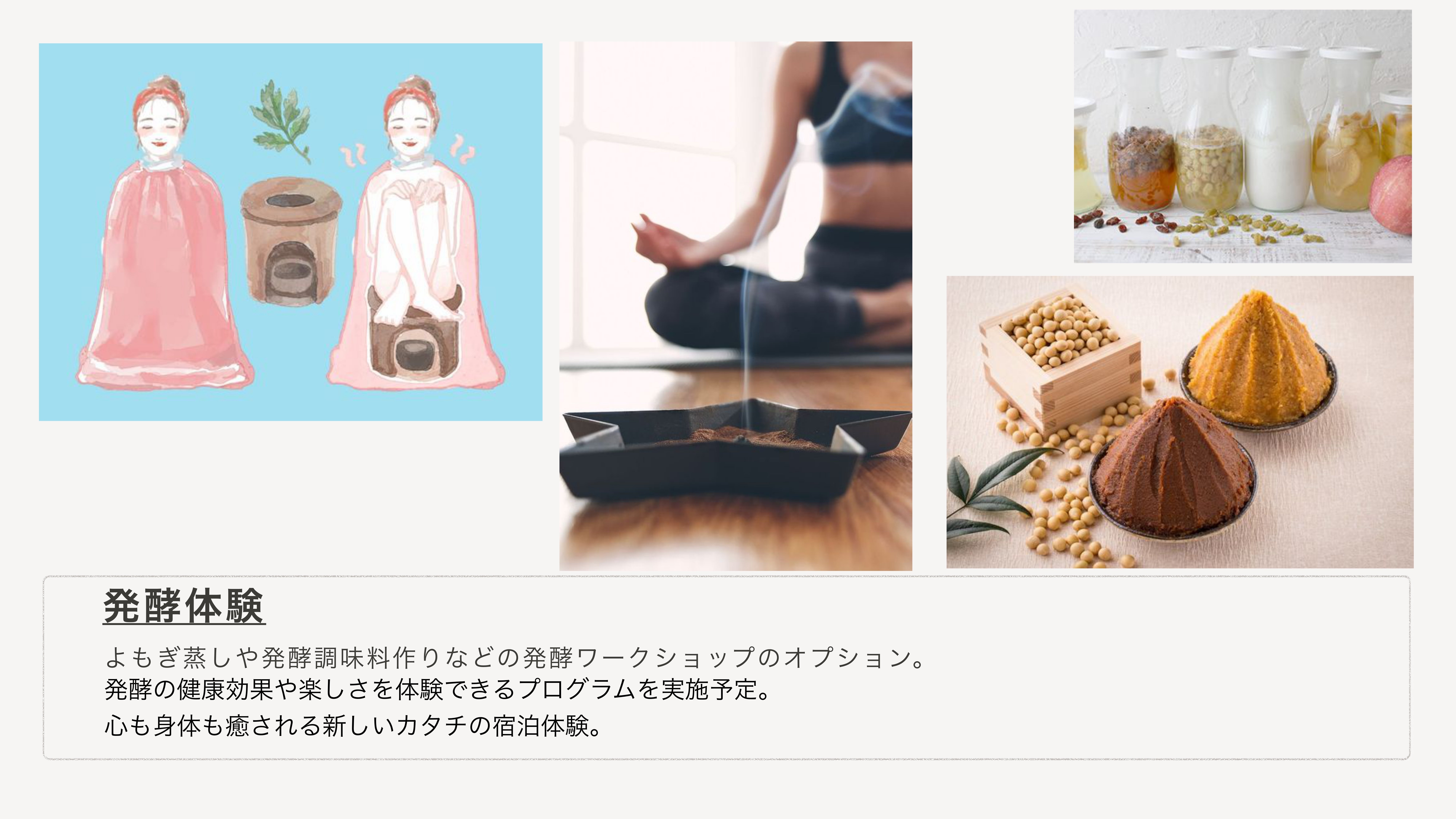 発酵体験として、宿の中に"よもぎ蒸し"の部屋をつくったり、ワークショップとしてヨガ講師・発酵料理家・大豆から育てて様々な調味料を作る先生たちと一緒にここでしか出来ないワークを準備中です。