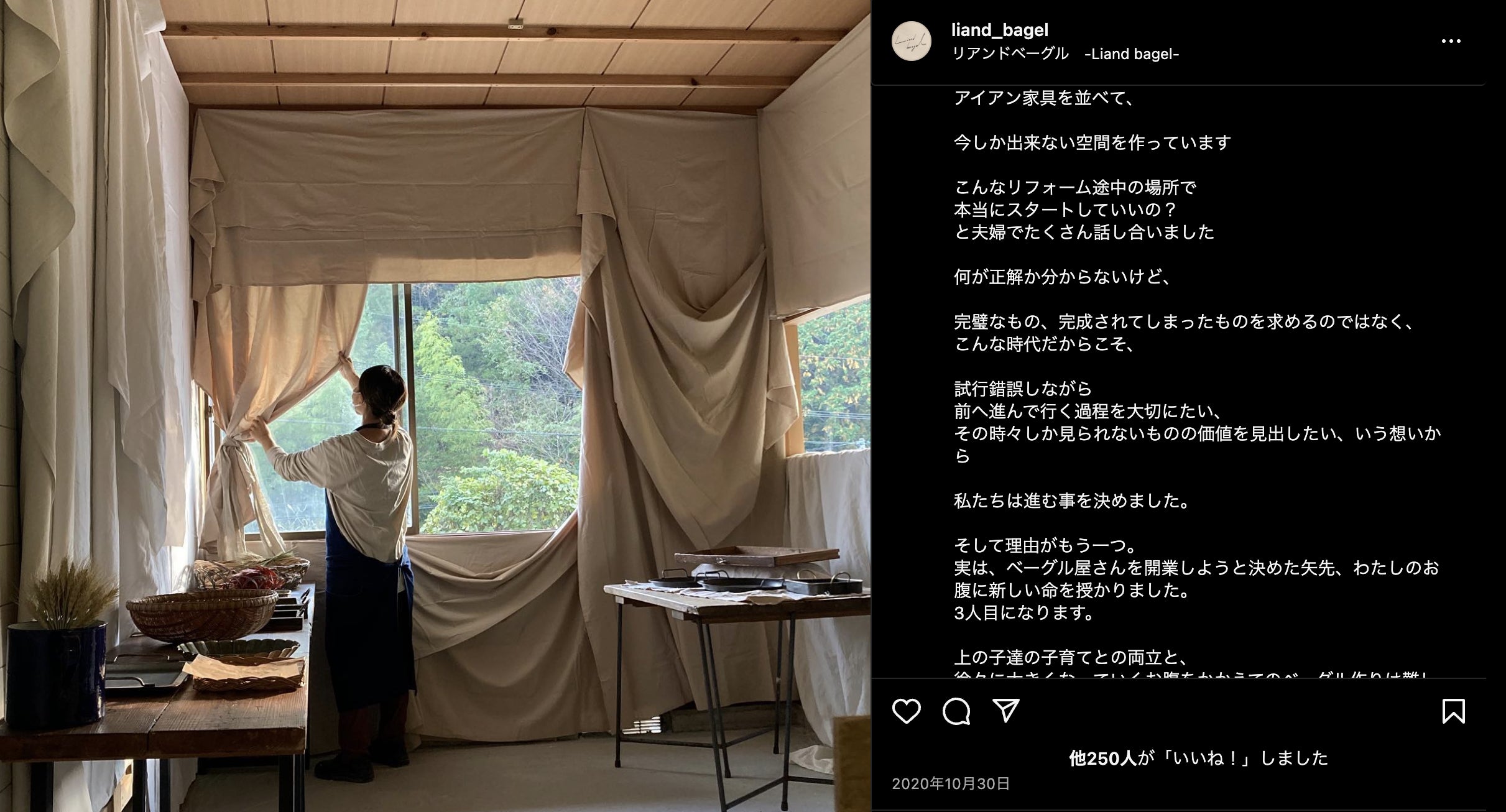 コロナ禍でデザイン系の仕事が無くなり、これからのライフスタイルや仕事を見直して行く中、この酵母でよく作っていたベーグルがきっかけとなり、2020年10月30日に「リアンドベーグル」をオープン!