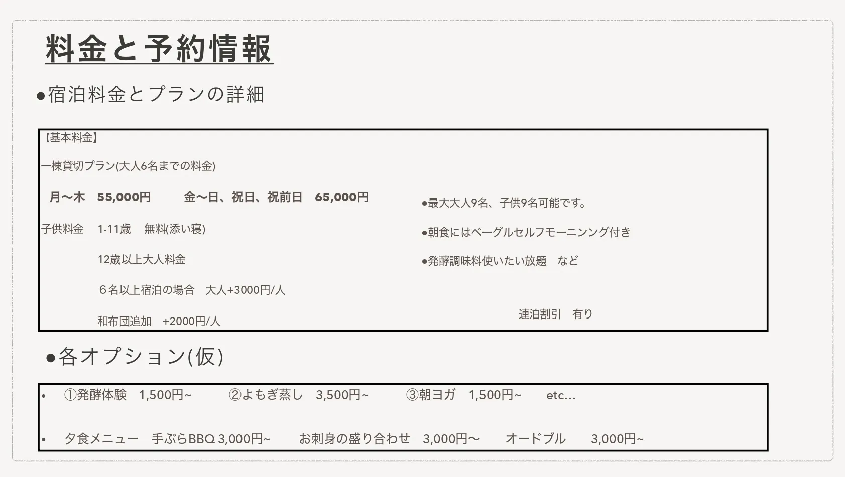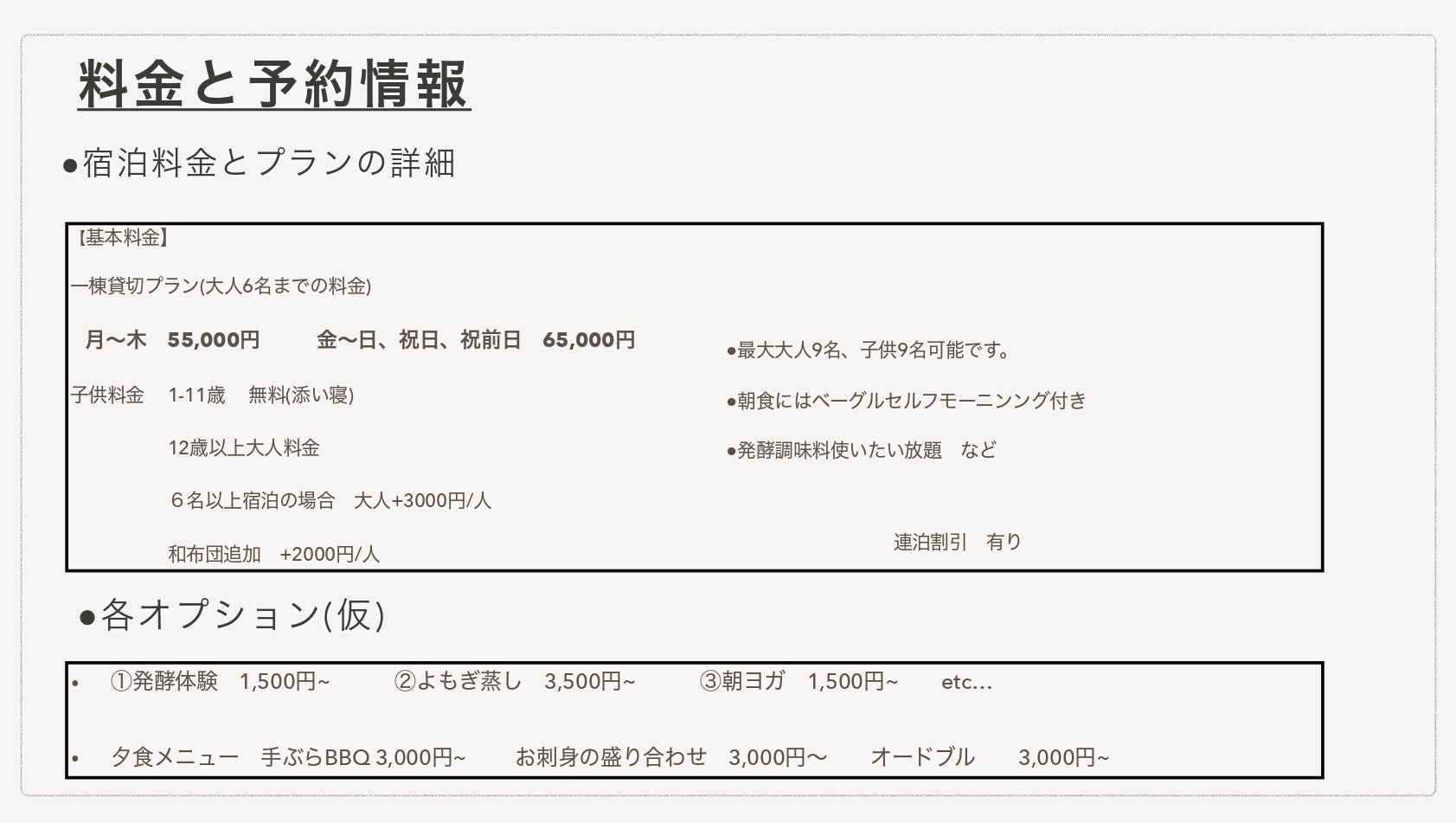 料金の設定については とことん悩みましたが、一棟貸切の料金としては最大限泊まりやすい料金設定としました。