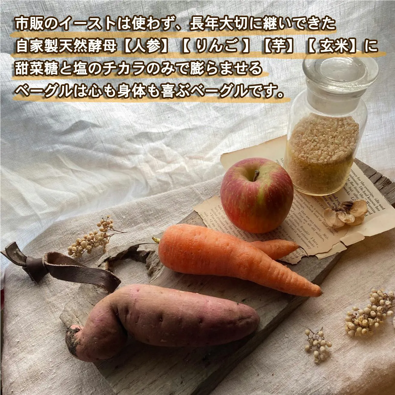私たちのベーグルは、市販のイーストを使わず、自家製酵母【人参】【りんご】【芋】【玄米】を発酵させ、甜菜糖と塩だけで膨らませたシンプルなものです。そして具材もできる限り手作りで無添加なものを使用。