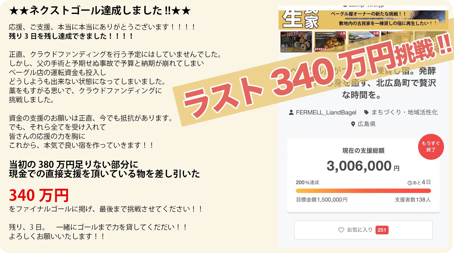 2024/11/24 17:34現在、233%達成!支援者数 162人!いよいよ本日が 最終日。そして、 残り6時間 でこのクラウドファンディングが終了します!!まずはここまでご支援くださった皆様、本当にありがとうございます!!皆様の応援のおかげで、目標額を大きく超えることができ、プロジェクトを実現するための大きな一歩を踏み出せました。たくさんの方々の温かいお言葉やシェアも、私たちの大きな励みになっています。リアンドベーグルのカウントダウン投稿最後のお願い残りわずかな時間ですが、 もう一度だけお力をお貸しください!「支援したかったけれど、タイミングを逃してしまった」「この宿の未来に少しでも貢献したい」そんな方々がいらっしゃいましたら、ぜひこの最後の6時間をきっかけにご支援いただけたら幸いです。また、ご家族やご友人にも、このプロジェクトをご紹介いただけたら嬉しいです。残り6時間、最後まで走り抜けます!このプロジェクトが成功すれば、 一棟貸切の宿だからこそ叶えられる特別な体験 を、より多くの方々にお届けできます。ファミリーでの旅行、友人グループとの再会、三世代のお祝いなど、普通のホテルでは味わえない時間をここで実現していただきたいと思っています。泣いても笑っても、あと 6時間 です。最高の笑顔でこの挑戦を締めくくりたいと思います!引き続き、 ご支援と拡散 をよろしくお願いいたします! もっと見る