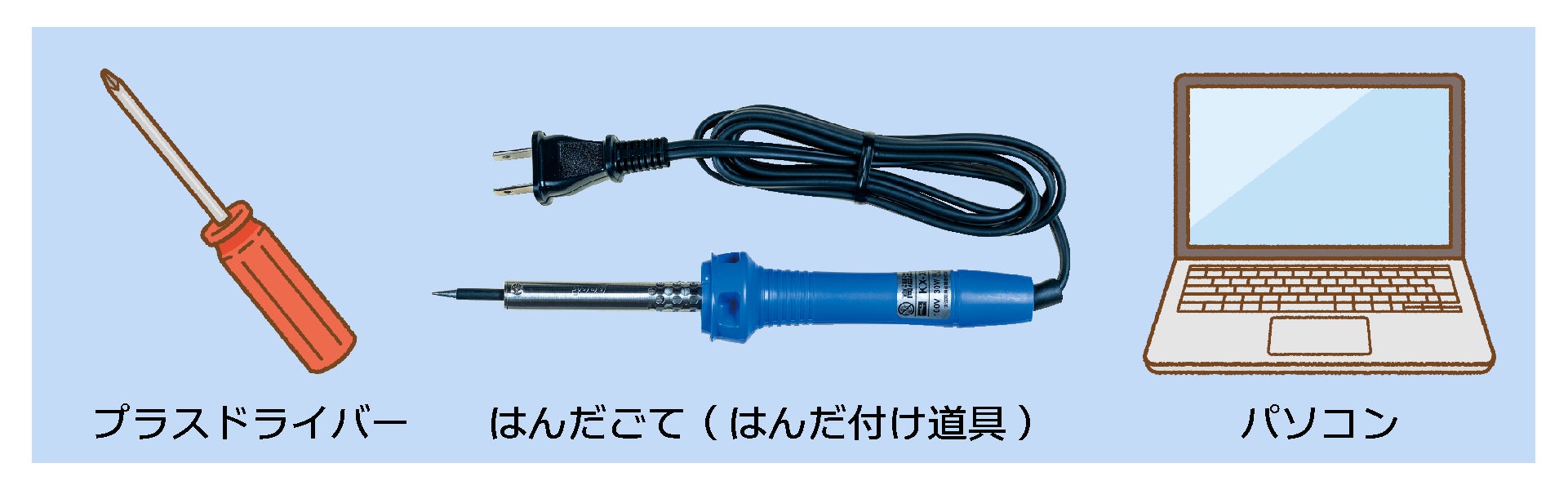 はんだ付けやドライバーによる組み立てをするため、最低限の工具が必要です。