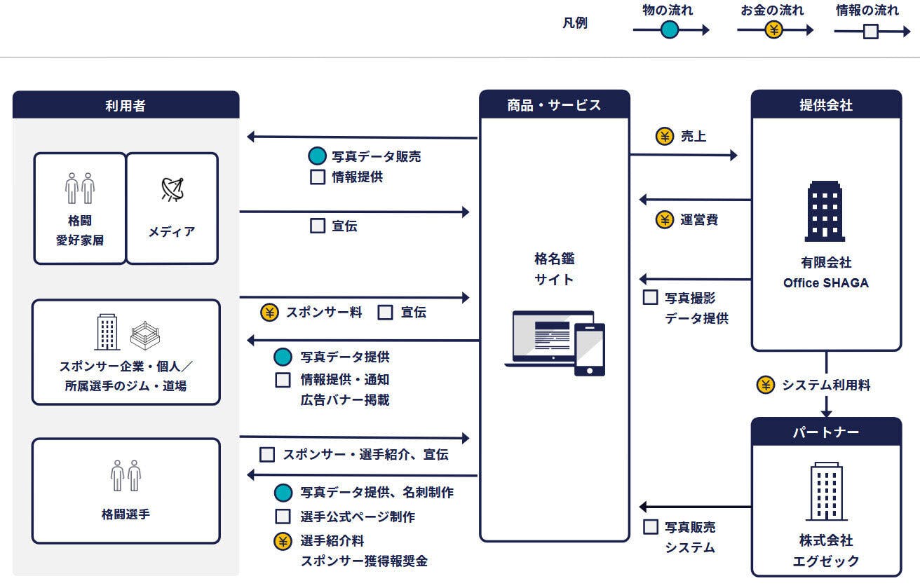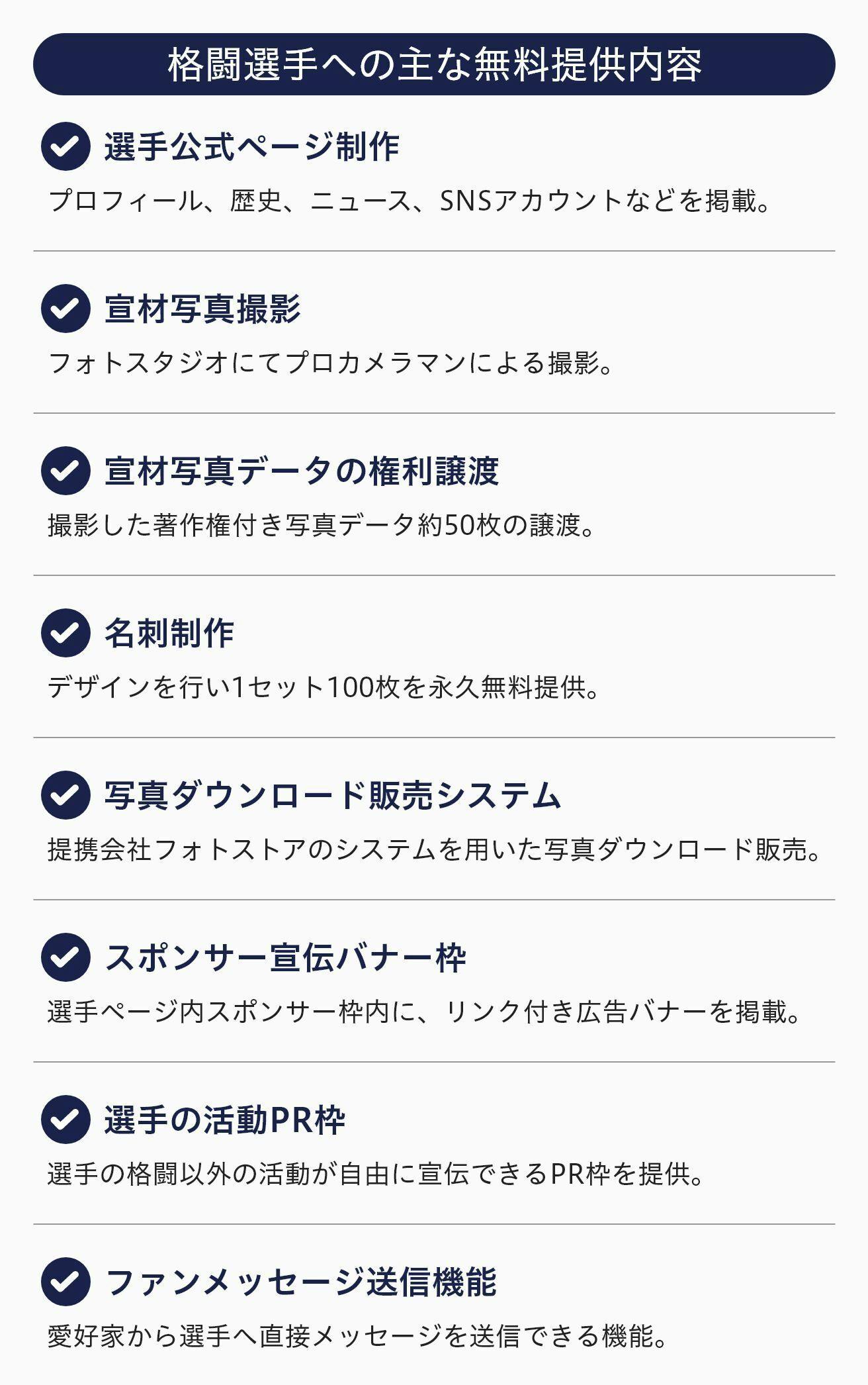 →格闘選手の全ての最新情報を集約した格名鑑選手公式ページをインターネット上に公開することで、いつでも誰もが閲覧することができる仕組みを提供する。