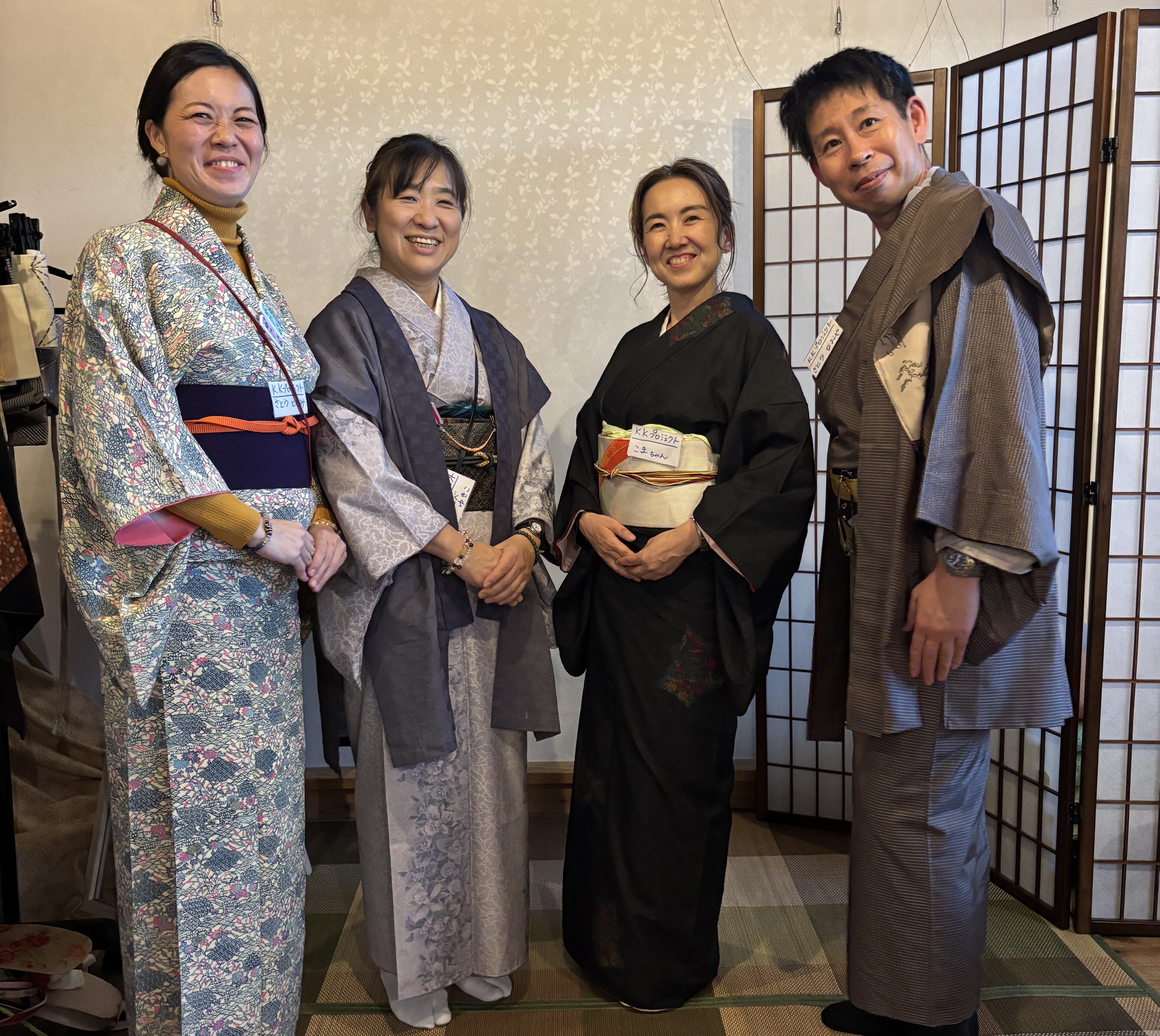 そんな、日の目を見ない…いわゆるタンスの肥やしになってしまっている着物を、プロの和裁師の方(左から2番目の渡辺幸子さん)にリメイクして頂き、復活させようじゃないか!!というもので。
