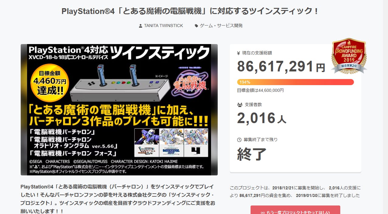 「PlayStation®4『とある魔術の電脳戦機(バーチャロン)』をツインスティックでプレイしたい!」というファンの皆さんの声に応えて始まったこのプロジェクトは、皆さんから多くのご支援・ご協力をいただくことでクラウドファンディングが成功し、ツインスティックの商品化が実現しました。