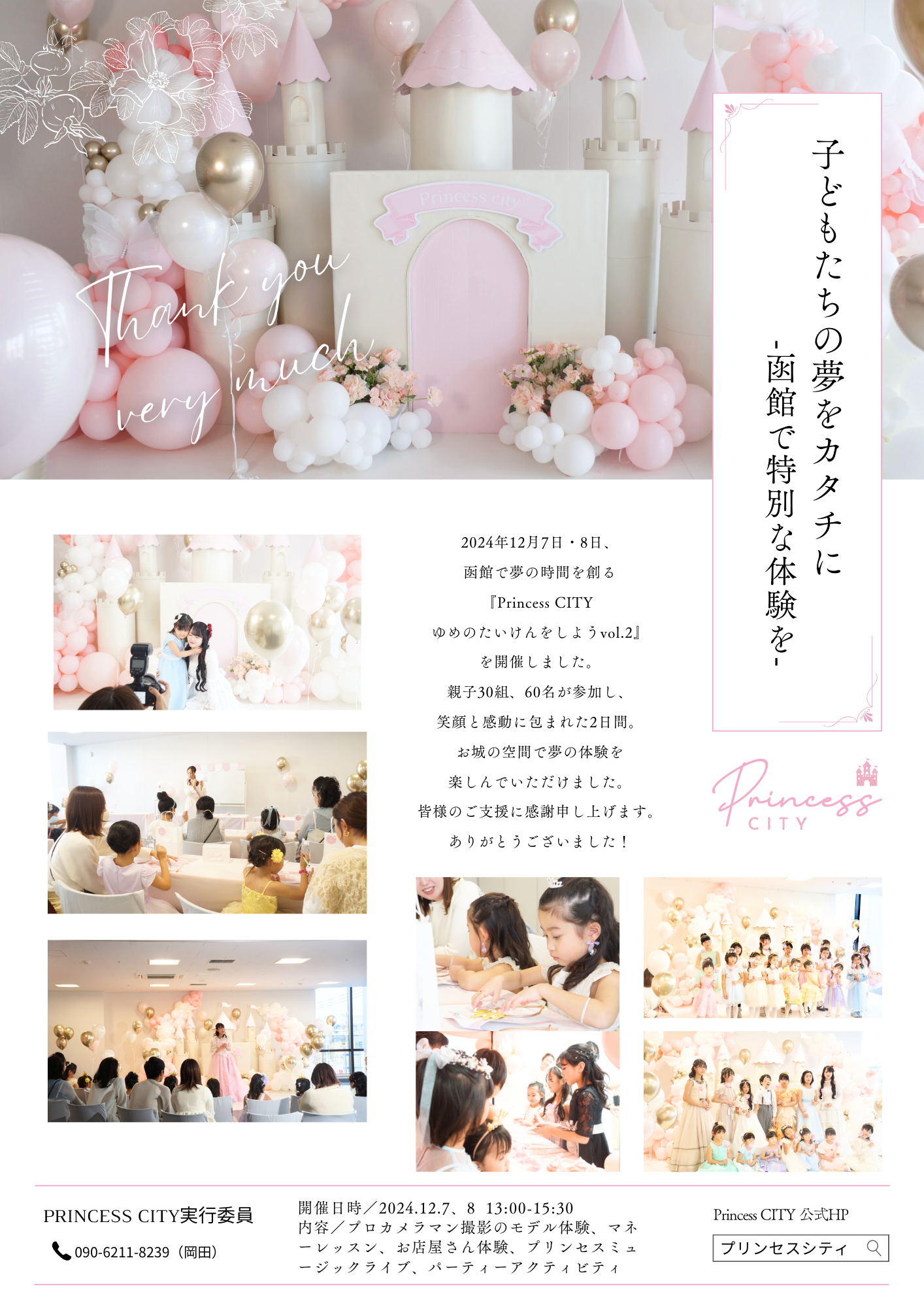 2024年12月7(土)・8(日)、ここでしか出会えない夢の空間と体験『Princess CITY -ゆめのたいけんをしようvol.2』を笑顔と感動とともに無事に開催することができました。両日とも雪の降る中でしたが、親子30組、60名の方にご参加いただきました。前日までに関東や札幌からスタッフが集まり寝る時間を削りながらも子どもたちの喜ぶ顔を見るためにOPENギリギリまで、細部までこだわって妥協することなくスタッフ一同で準備をしました。そして開催当日。日本では…そして世界でも珍しい、立体的なお城を取り入れたバルーンいっぱいの空間に、 ドレスを着た可愛いプリンセスたちが大集合!夢の世界のような時間を皆で楽しみました。可愛いブースではモデル体験やマネーレッスン、アイテム制作、さらにプリンセス通貨を使ってのお店屋さんごっこ!その通貨でおやつやミュージックチケットを購入!そして心に響く歌声の「ひめさん」のプリンセスミュージックライブ。一緒に歌ったり、振り付けをしたり、親子で楽しみました♪最後には円になって子どもたちを「夢」を聴き、みんなでパーティーポッパーを割り紙吹雪が舞いました!子どもたちからは、「楽しい!」「プリンセス可愛い♡」「またやりたい」「次も絶対来る!」保護者の皆様からも、「函館でこんな素敵なイベントを開催してくださり嬉しいです」「子どもが『プリンセスになれた!ママありがとう♡』『カチューシャ作り楽しかった』とずっと話していました」「幸せな気持ちになりました♡」「普段恥ずかしがり屋の娘が手を上げて夢を話していてイベントを通して成長を感じました」といった嬉しい声をたくさんいただきました!そのような声に触れたスタッフ一同も、感謝と幸せな気持ちで胸がいっぱいです!このような夢の体験を提供できたのは、ご協賛、ご支援、ご後援そして応援してくださった皆様のお力添えのおかげです。沢山の笑顔につつまれたイベントで素敵な写真が沢山撮れたので、順次この場でもご報告させていただこうと思います。まずは無事に開催できたことのご報告と感謝の気落ちをお伝えさせていただきます。本当にありがとうございました!
