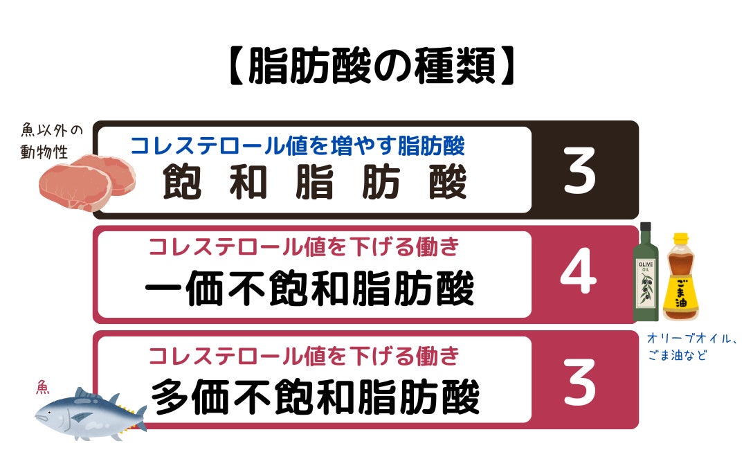 「不飽和脂肪酸」は植物油に多く含まれているもので、血中コレストロール血を低下させる作用があると言われています。脂肪酸は、飽和脂肪酸・一価不飽和脂肪酸(オレイン酸)・多価不飽和脂肪酸(a-リノレン酸)に分けられ、それぞれの摂取バランスが「3:4:3」の割合が理想のバランスといわれています。
