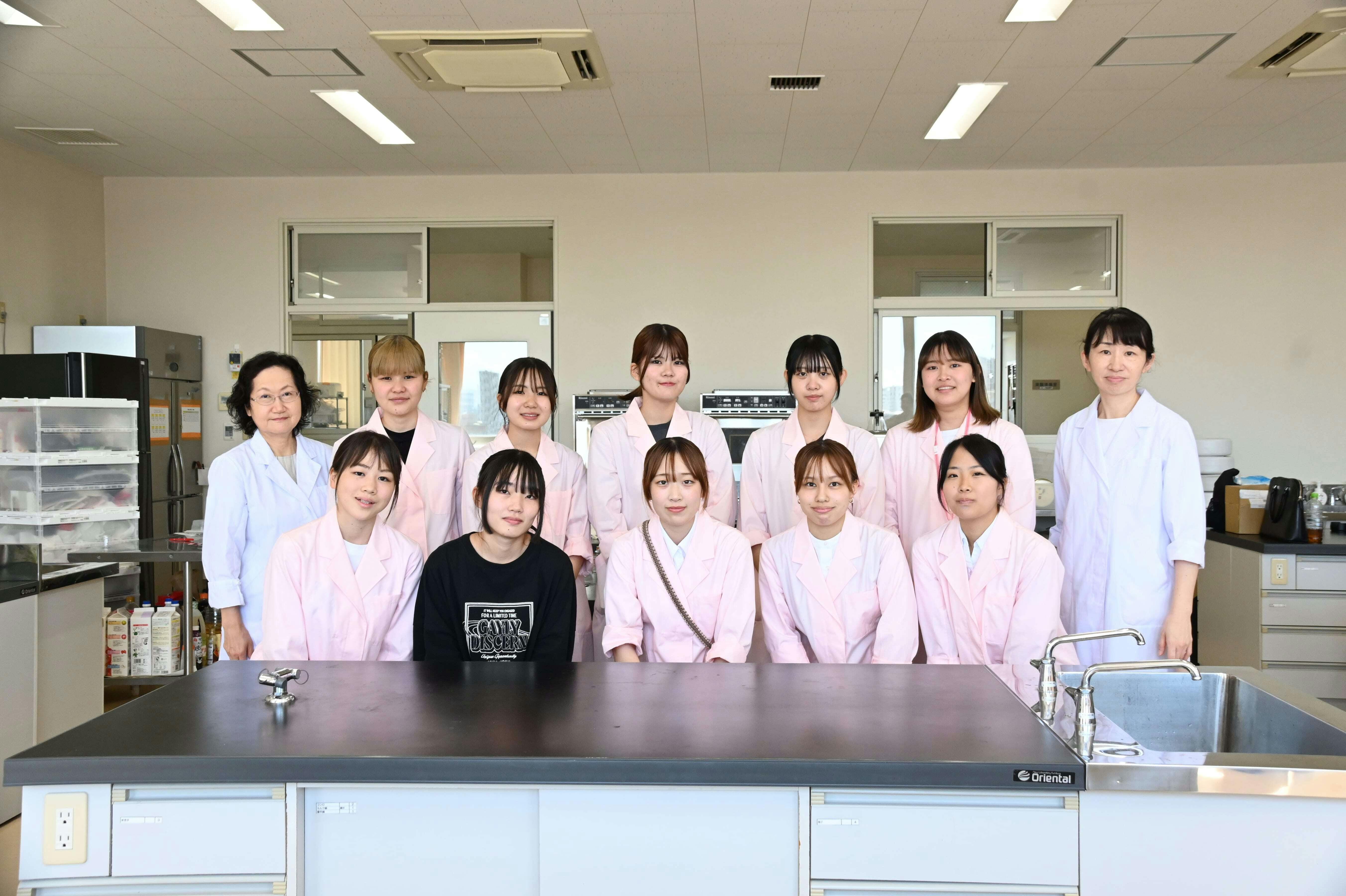 「鹿児島女子短期大学 食物栄養学専攻」教授の寺師先生とその学生さんたちでした。鹿児島女子短期大学 生活科学科 食物栄養学専攻の学生の皆さん