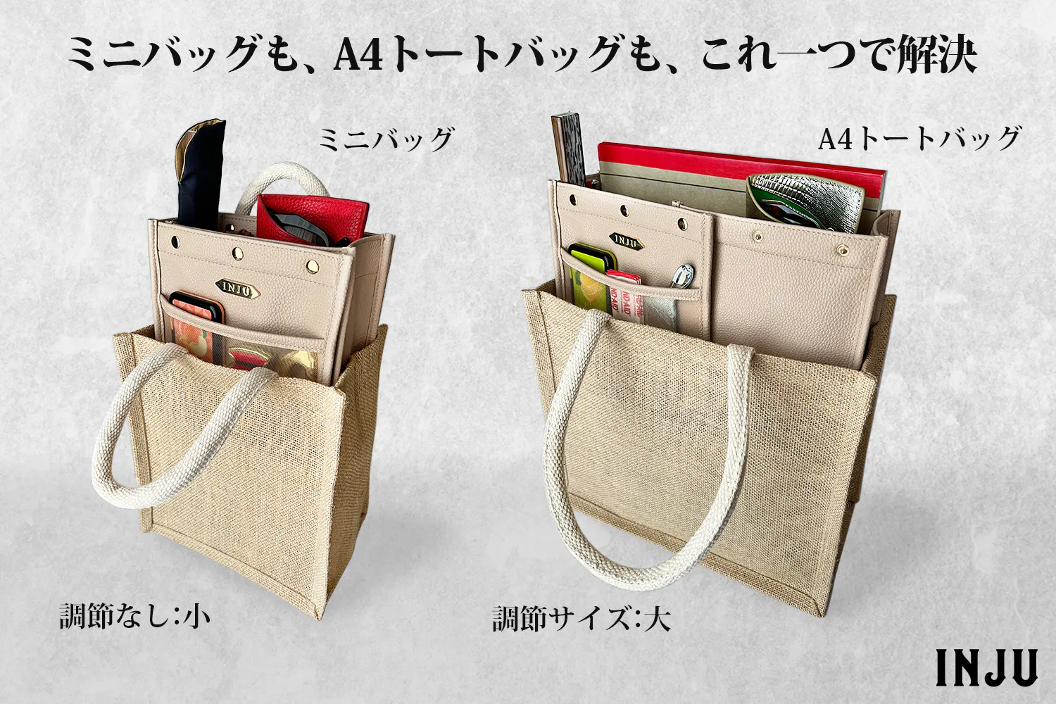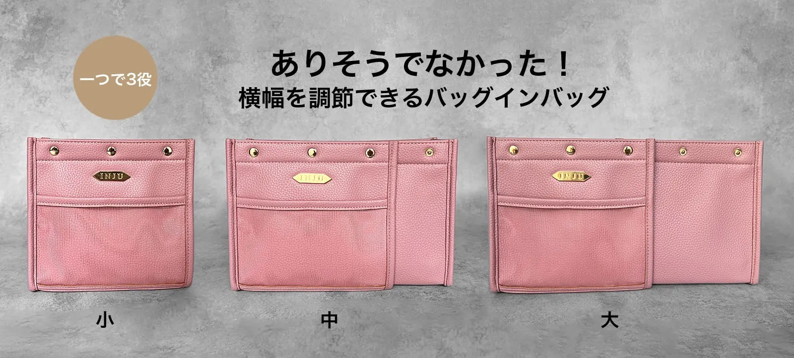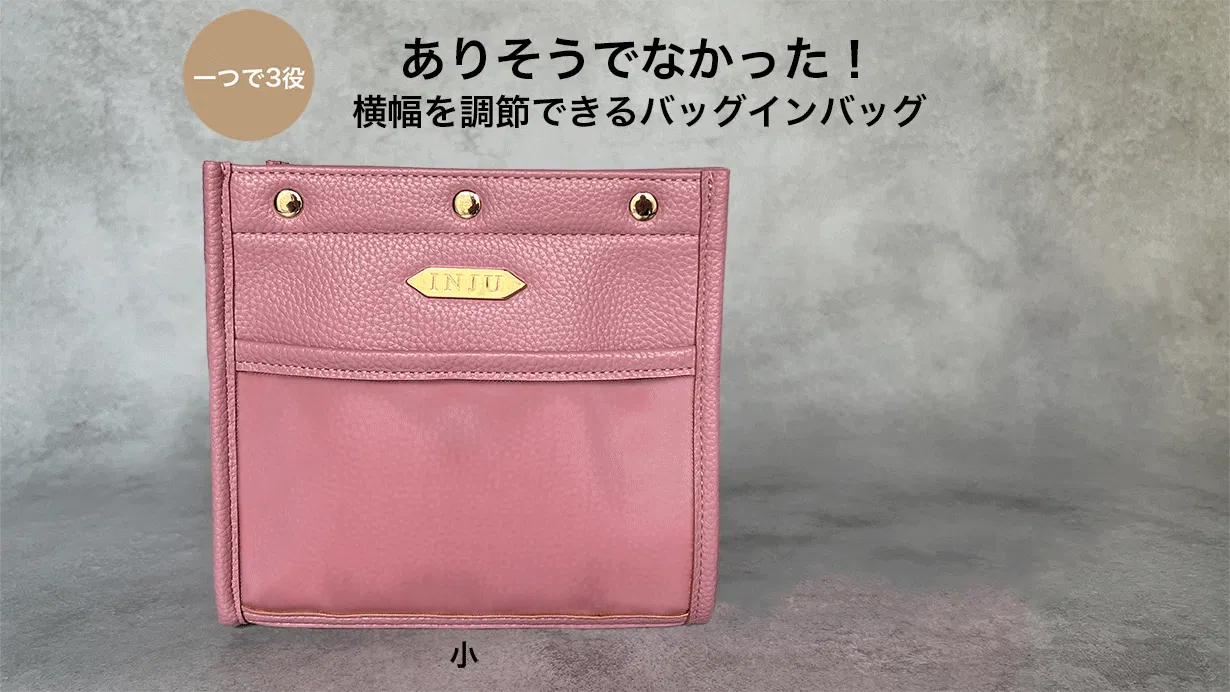 バッグのサイズに合わせて横幅サイズを調節をするだけ!一つのバッグインバッグで対応可能です。