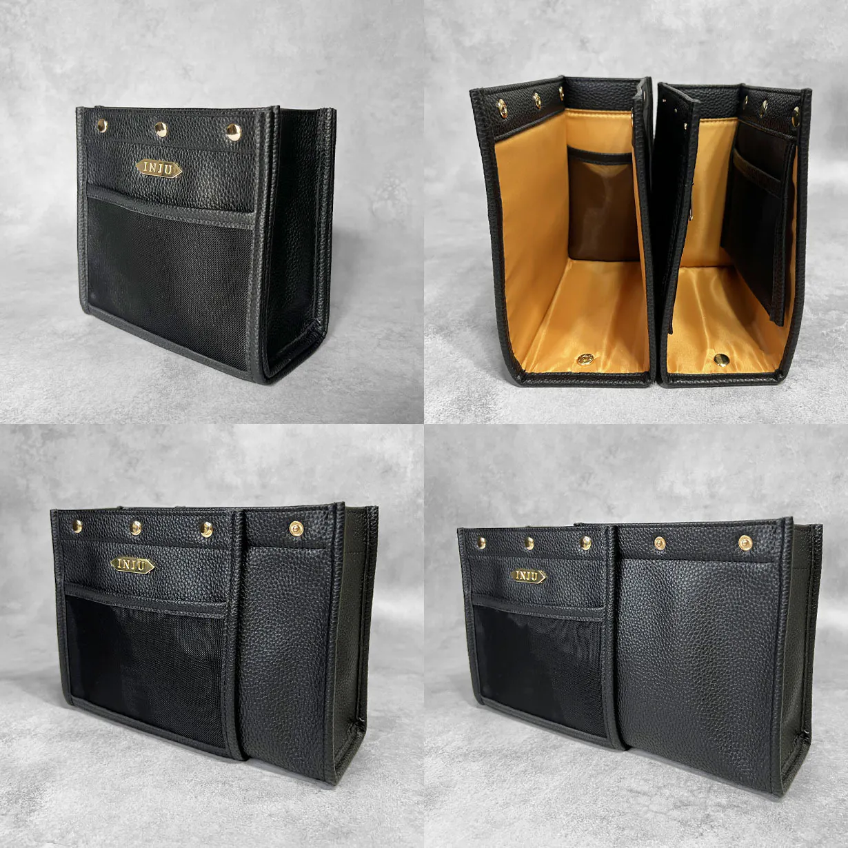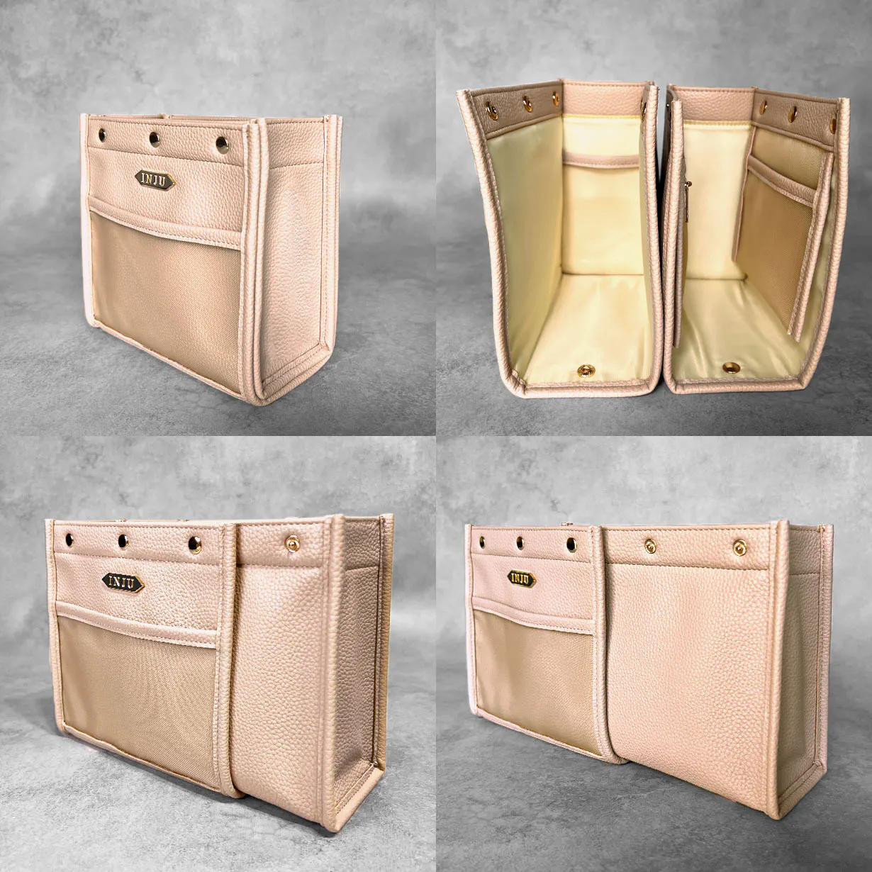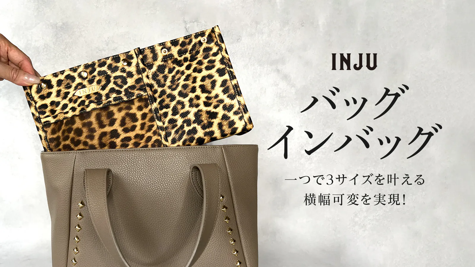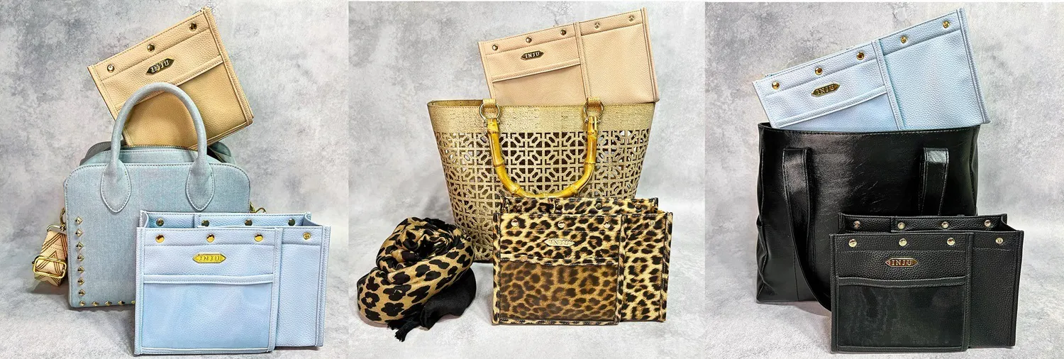 バッグや小物収納アイテムの内側を意味する「Inside」気持ちの内面を意味する「Inner」の頭文字をとり、人前に出しても恥ずかしくない品質で、ジュエリーを身に着けた時に体感するような歓びに満たされる小物収納アイテムとしてお届けしたい思いから「INJU」と名付けました。