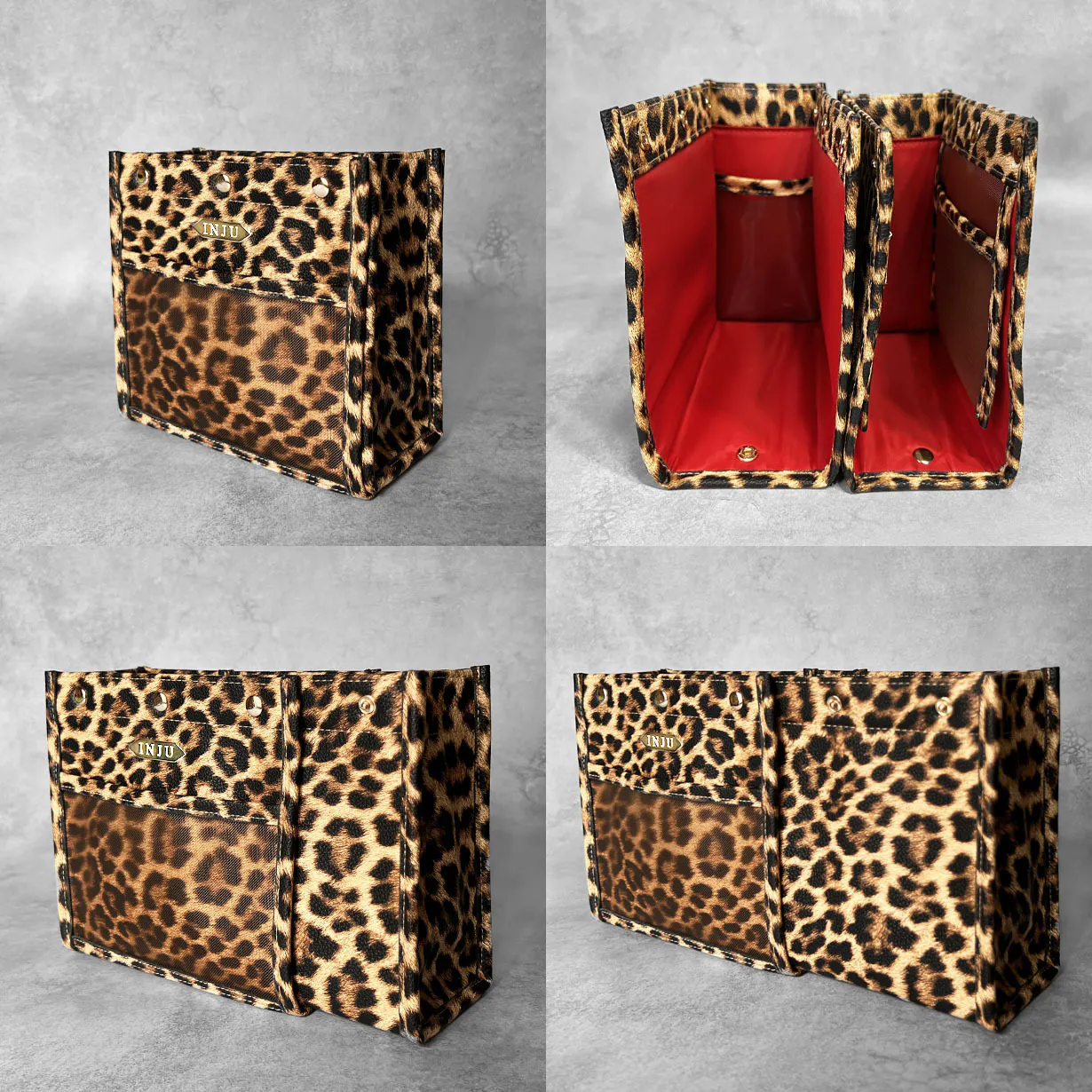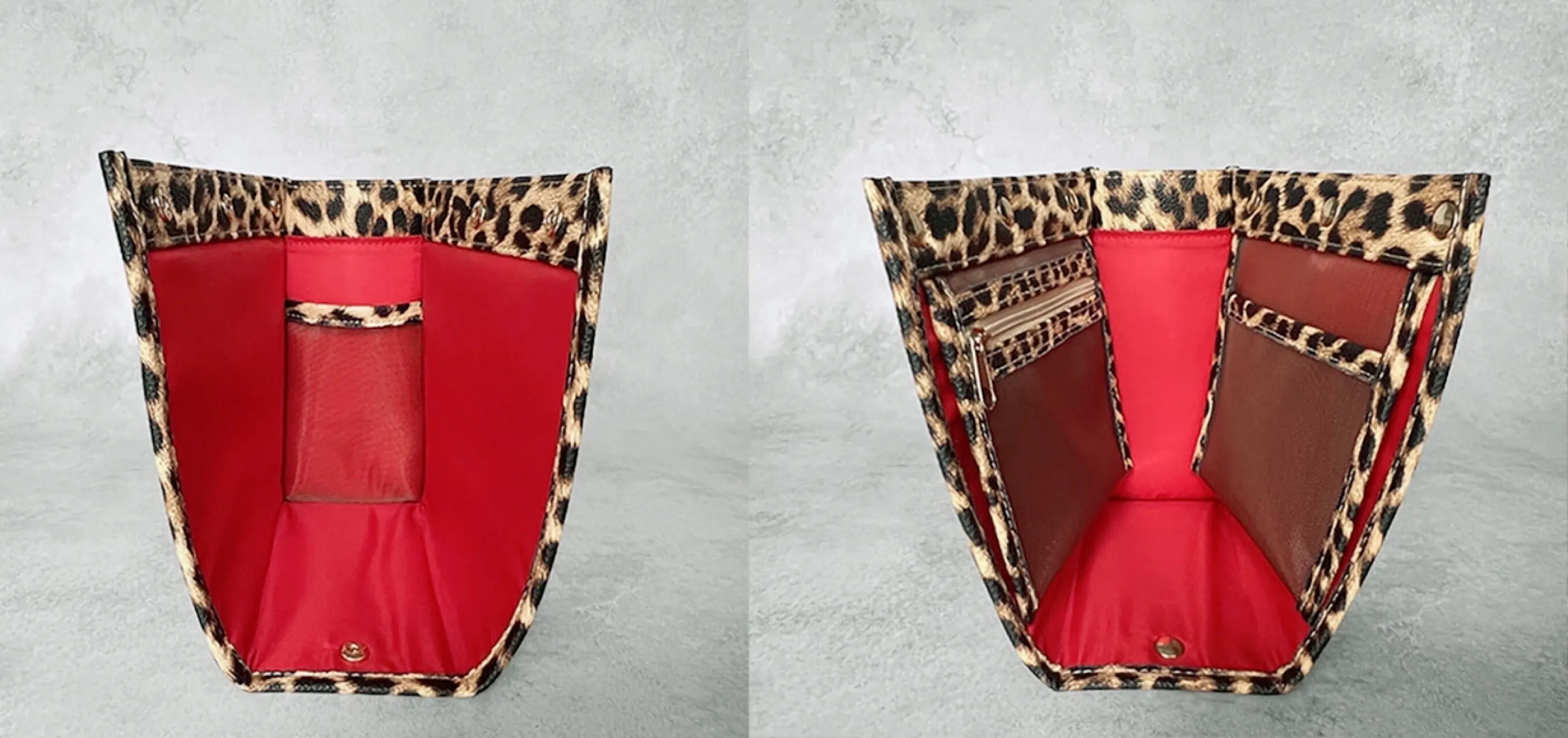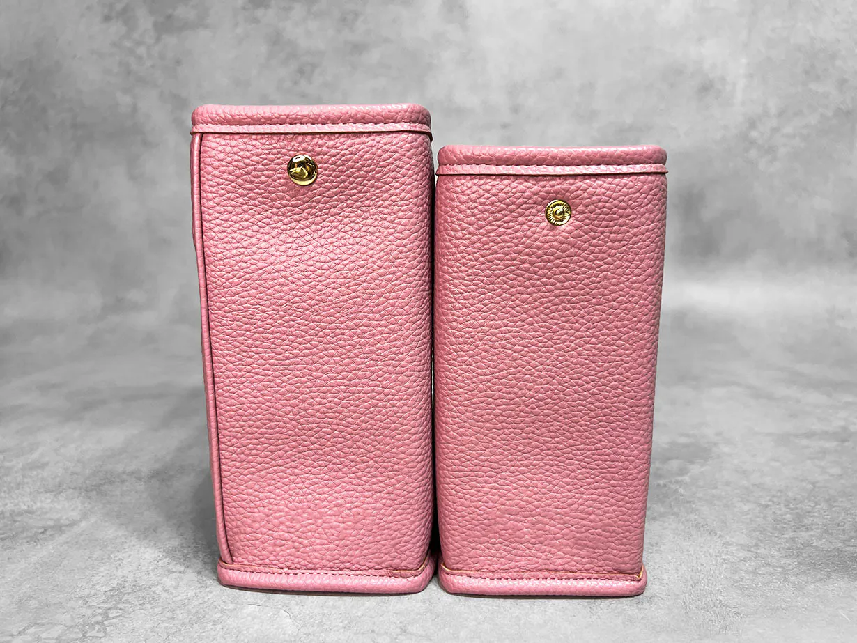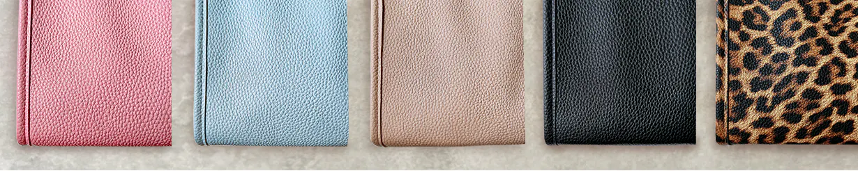 特許機能である入れ子式(二重構造)で仕上げるため約2倍のサイズを使用しており、軽さを保つためにPUレザーを使用。また、お手入れのしやすさ、小物収納としての価格を実現させるためにも本革の風合いに近いPUレザーを使用しております。5色ともキズの付きにくいシュリンクデザイン。レオパードのみ表面加工が異なります。
