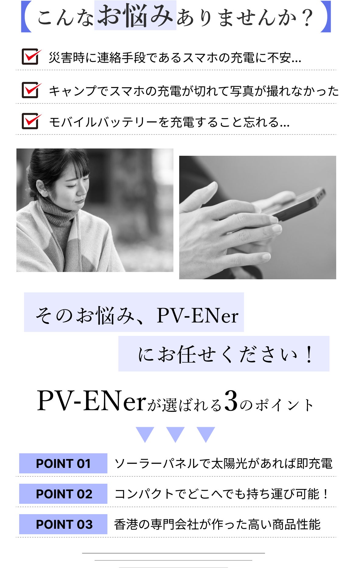 PV-ENer性能も良くコンパクトでどんな場面でも、あなたの役に立つ商品になるでしょう。キャンプやBBQ・川遊び・海水浴などや、大災害の恐れになり得る、南海トラフやその他大地震・土砂崩れ・大雨・嵐・台風・火災などの災害時に連絡手段として必要なスマートフォン。