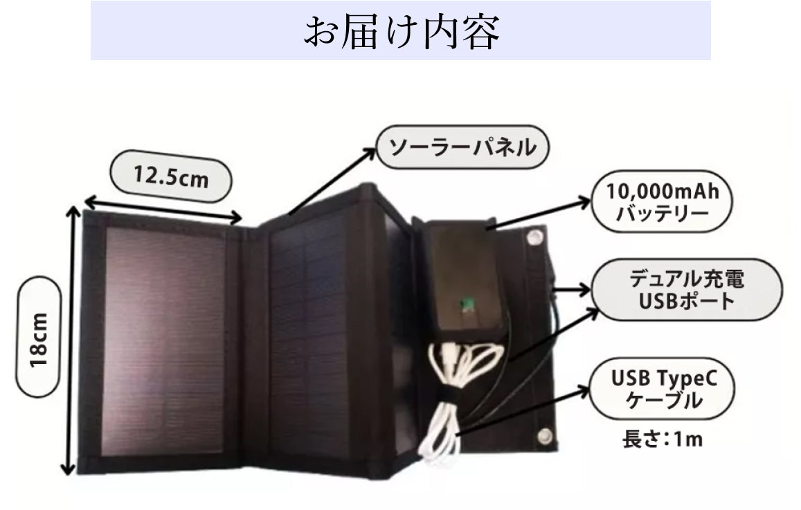 ソーラーパネルから取り込んだ太陽光エネルギーを大容量の10,000mAhのリチウムイオンバッテリーバンクに蓄電し、電力が必要な場面で仕様することが出来ます。様々なデバイスに電力を供給するUSBポートがついているため、アウトドアや災害時にも使えます。