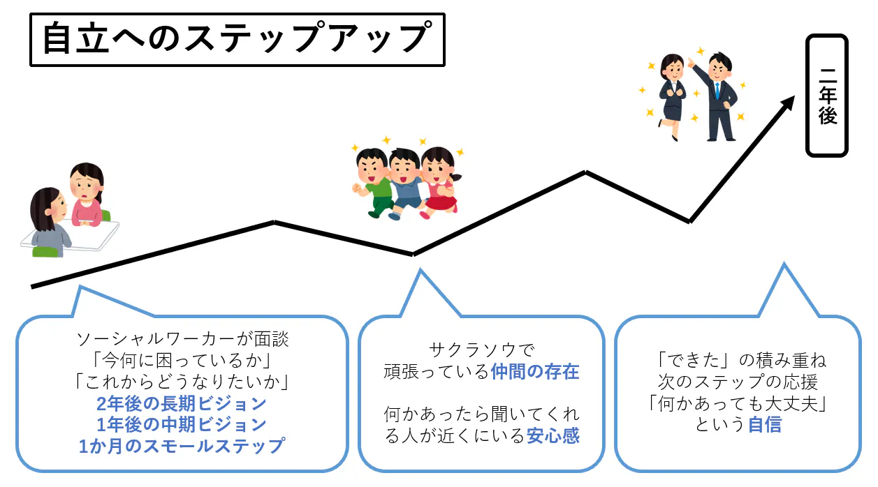 また、サクラソウに入居する若者同士も、「同じ仲間がいるから頑張ろう」「自分はひとりじゃない」とお互いに支え合える「依存先の一つ」になることができます。