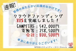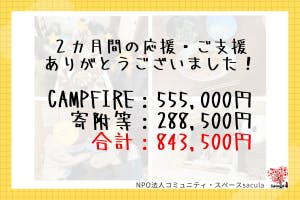 2024/12/03 11:5711月30日をもちまして、クラウドファンディングが終了しました!2カ月間の応援・ご支援ありがとうございました!-目次①最終結果②「匿名」で支援してくださった方へ③マンスリーサポーターさん募集❀.*・゚✿゜:。*❀.*・゚✿゜:。*①【最終結果】CAMPFIRE:555,000円 寄附等:288,500円 合計:843,500円最終的に目標額に対して84%まで到達することができました!saculaとして、久しぶりのクラウドファンディングでしたが、皆さんのご支援・SNS等でのシェアのおかげでここまで到達することができました。本当にありがとうございます!集まったお金は、敷金などの初期費用やサクラソウを整えるための準備費用などに使わせていただきます。リターンについては、また順次発送・イベントの案内を送らせていただきます。少々お待ちください。❀.*・゚✿゜:。*❀.*・゚✿゜:。*②【匿名の方へ】今回、匿名での寄附が大変多く、またリターンを必要としない応援を数多くいただきました。本当にありがとうございました。上記のことをサクラソウの入居者に伝えたところ、「ぜひともお礼がしたい」という声があがっています。匿名で寄附していただいた方で、もしよろしければ住所・お名前を教えていただければと思います。❀.*・゚✿゜:。*❀.*・゚✿゜:。*③【マンスリーサポーターさん募集】NPO法人コミュニティ・スペースsaculaでは、法人を支えてくださるマンスリーサポーターさんを随時募集しています。月々500円からsaculaに繋がる子ども若者をサポートすることができます。今回のプロジェクトを通して、saculaを知り、興味をもってくださった方は、公式ホームページよりお申込みください。≪コミュニティ・スペースsacula公式ホームページ≫ もっと見る