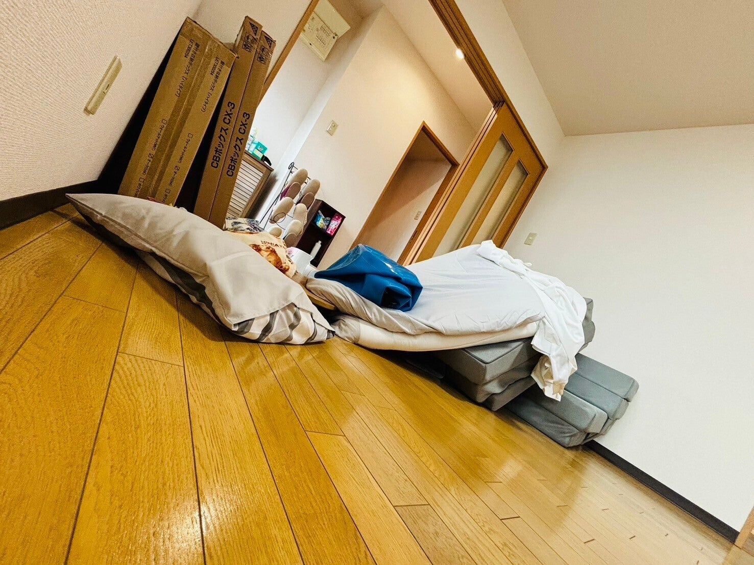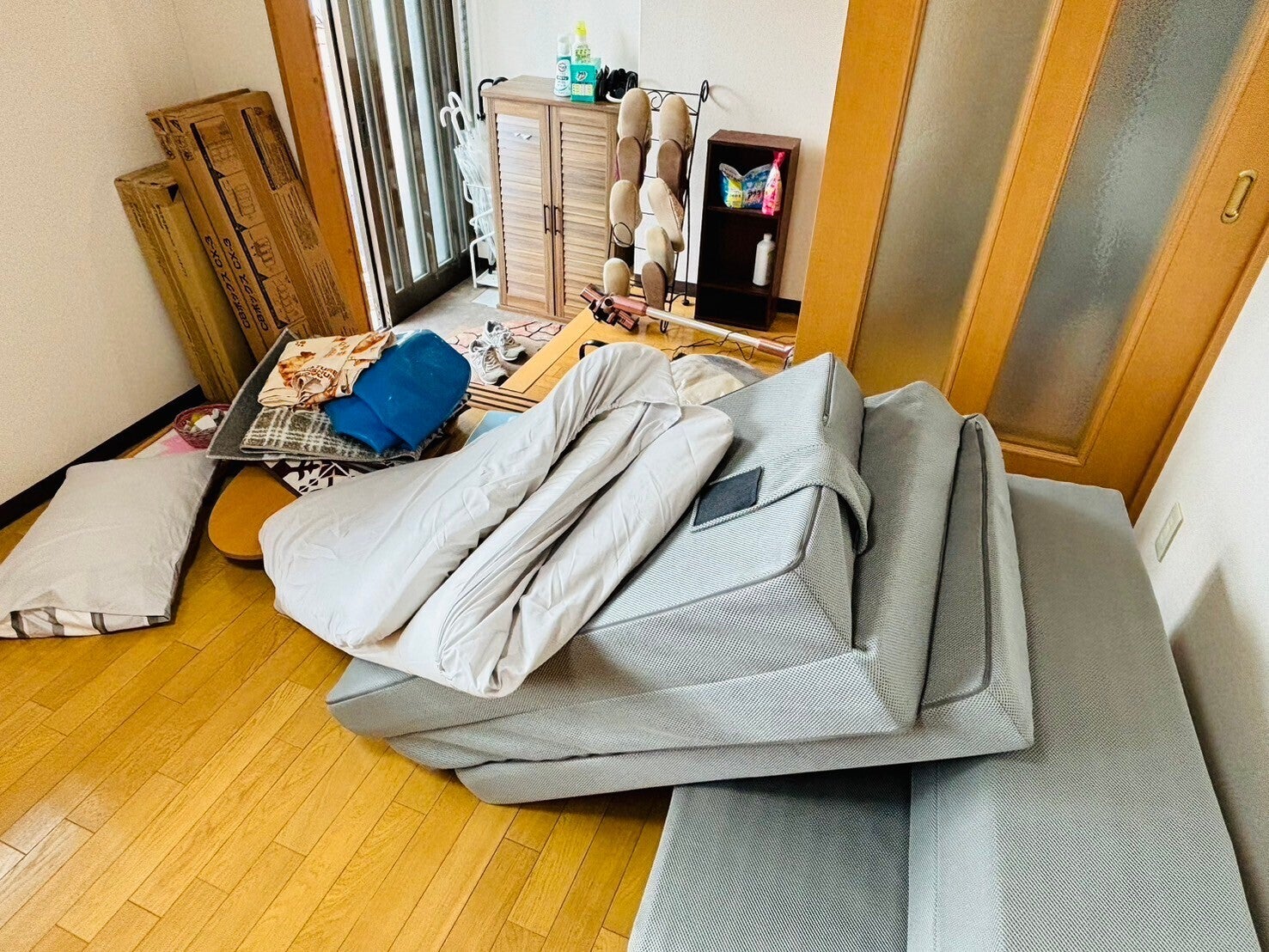 緊急宿泊用のソファベッドや靴箱などを業者を使わず、スタッフみんなで運び出しています!